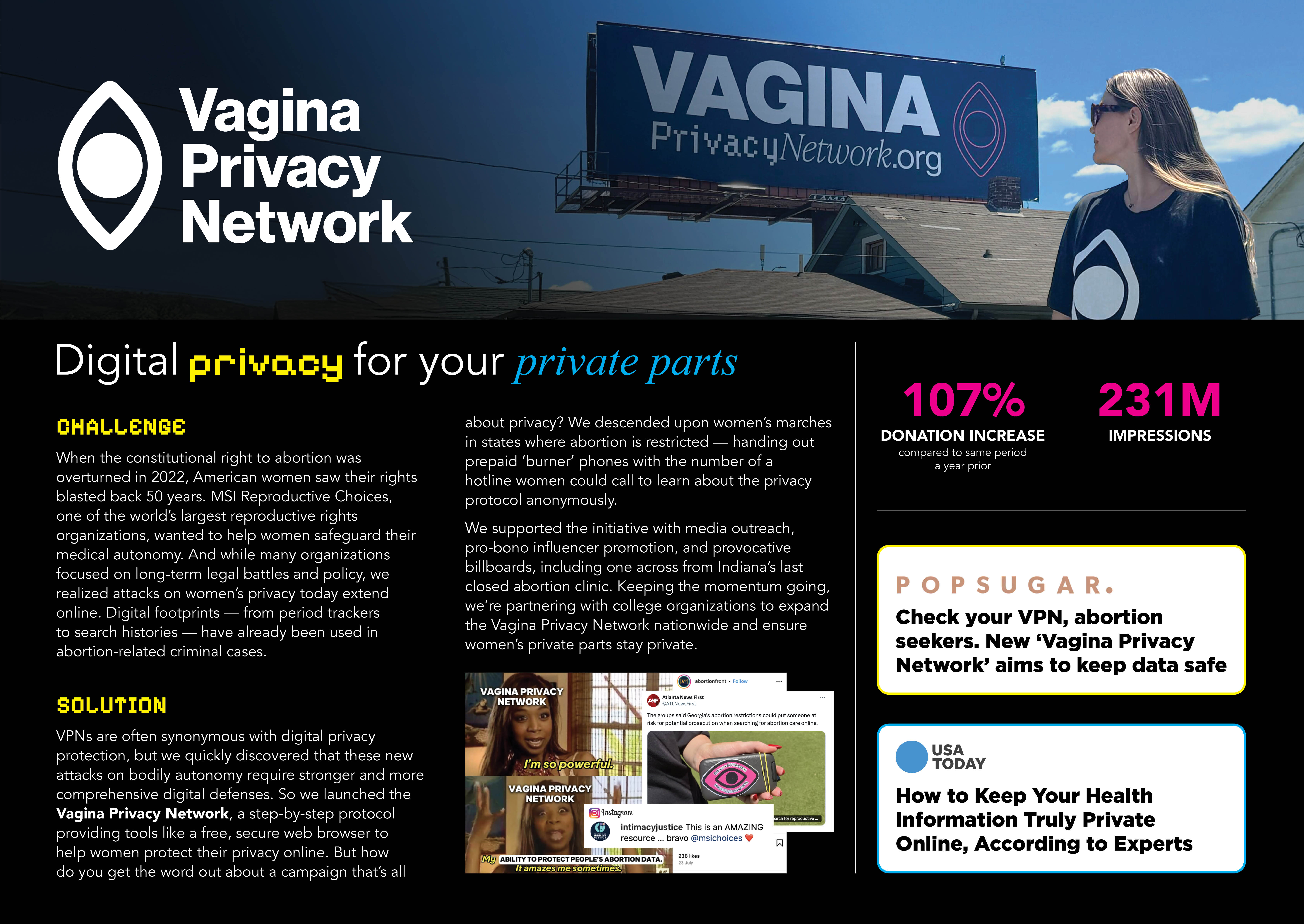We supported the initiative with pro-bono influencer promotion and embargoed media outreach. The campaign’s logo, the ‘Vag-Eye,’ became a symbol of the constant digital surveillance women face. It featured prominently on billboards, including one across from Indiana's last closed abortion clinic. Keeping the momentum going, we’re partnering with college organizations to expand the Vagina Privacy Network nationwide.