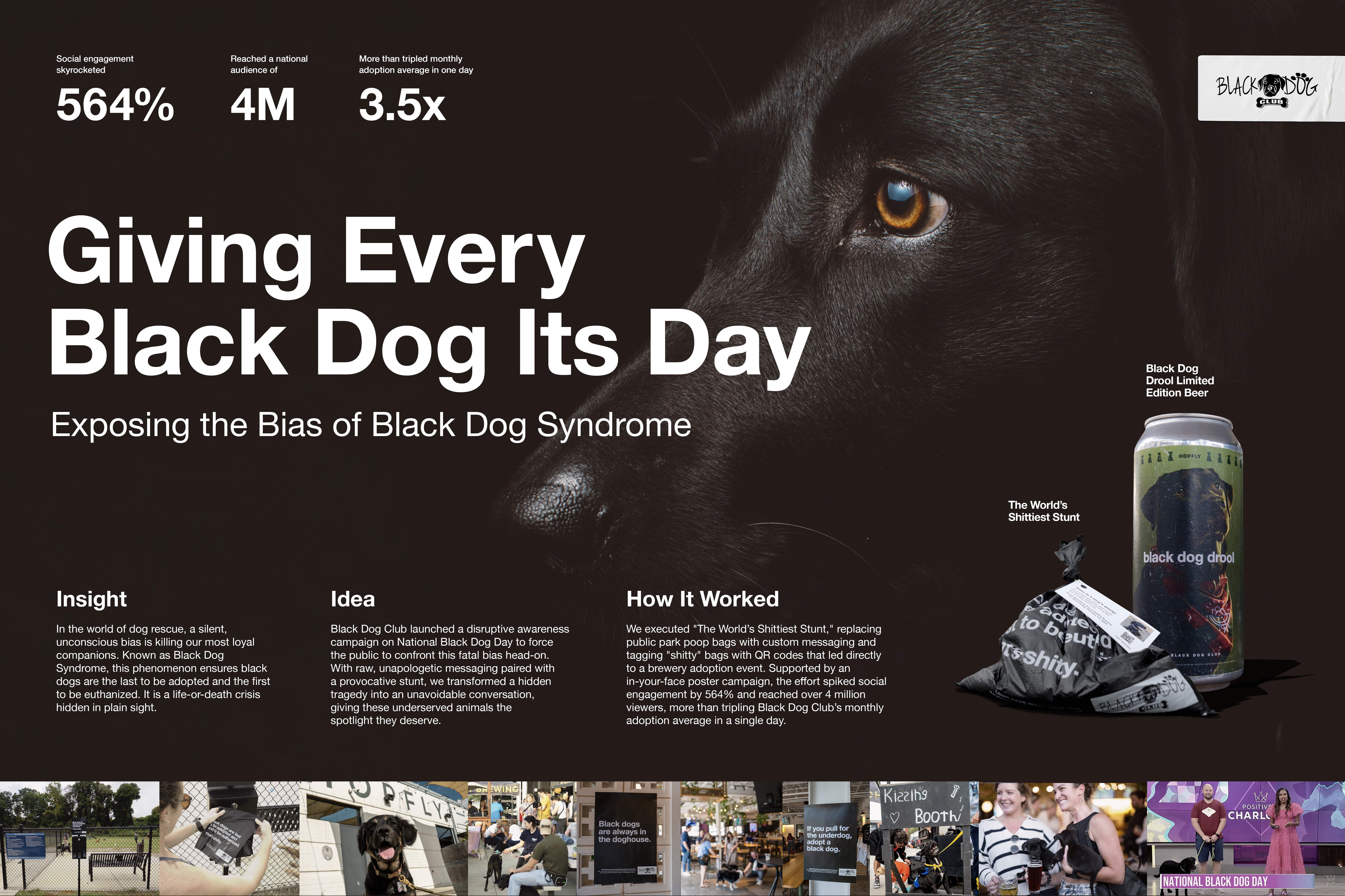 In the animal rescue world, there's a fatal hidden crisis known as Black Dog Syndrome. It's an unconscious cultural bias where black dogs are routinely overlooked by potential adopters. This makes them the last to be adopted and the first to be euthanized. Our objective was simple but urgent. We wanted to build an initiative to combat this exact issue and drive immediate behavioral change. With shelters at a breaking point, we couldn't afford a quiet launch. We had to jolt people into paying attention and force a national conversation about an invisible prejudice. Our goal wasn't just to build awareness. We wanted to physically intercept dog lovers in their daily routines, overcome compassion fatigue and directly connect them with overlooked shelter animals.