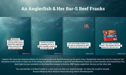 Shortly after the strategy launch, a rare deep-sea black seadevil fish went viral after passing away. The user-created, emotional storyline around its brief surfacing captured widespread attention but also left the audience in tears and wanting closure. Seeing a natural opportunity to lift spirits and connect, we created a TikTok still carousel to deliver “breaking news,” progressively revealing that the real reason the fish surfaced wasn’t to “see the light” as they assumed but to experience a glorious pack of Bar-S All Beef Franks.