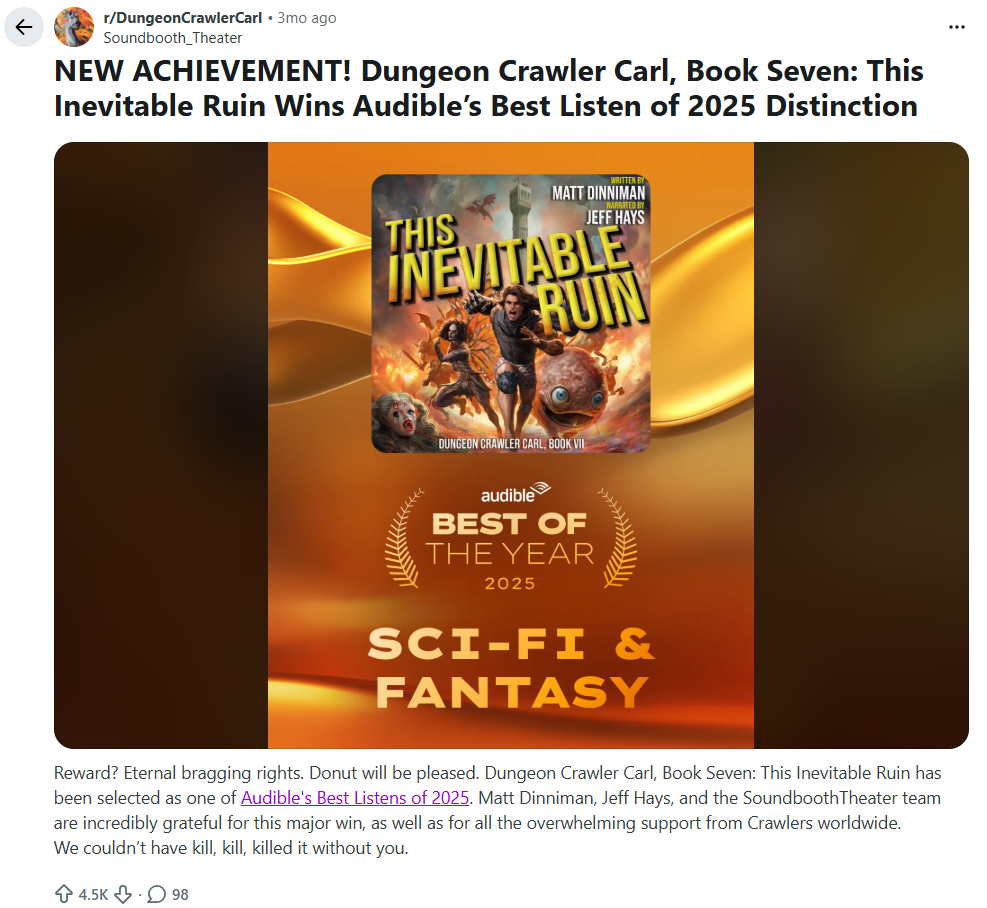 The campaign propelled Book 7 in the series - This Inevitable Ruin - to #2 on the New York Times Audio Best-Seller List (the first time any Dungeon Crawler Carl title reached the list in any format) and to #1 on the Audible Top Listens chart. The series has sold 3M+ copies with an 83% completion rate, over 80 million listening hours, and 4.9 stars from 15,000+ reviews.