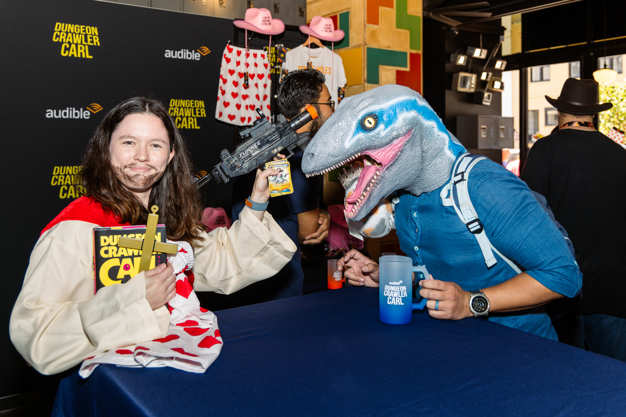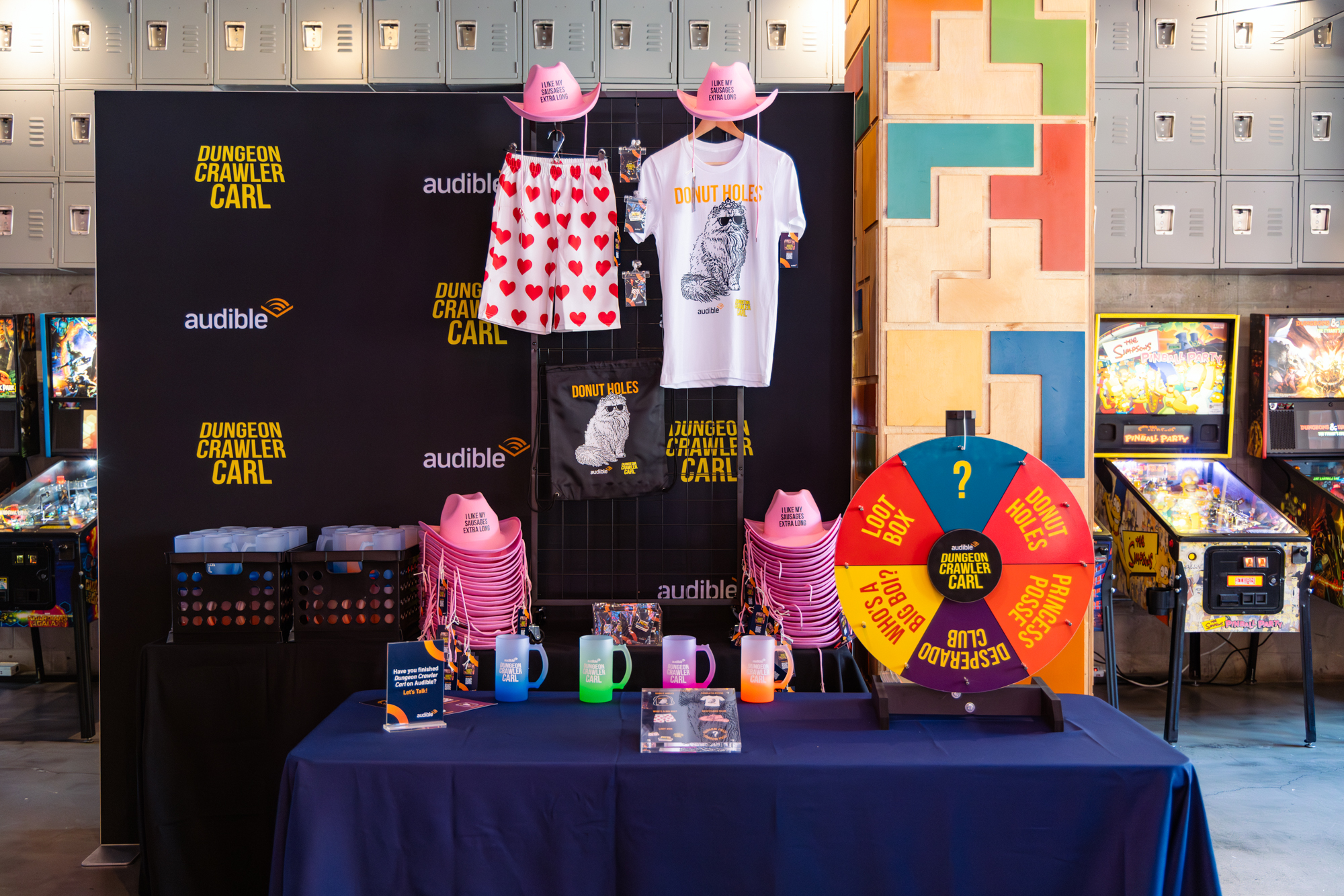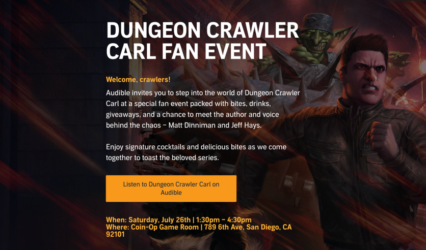 Audible brought Dungeon Crawler Carl to San Diego Comic-Con, featuring a sold-out fan event and a panel with Matt Dinniman and Jeff Hays, moderated by Maude Garrett (audiobook tastemaker, 108K followers). The panel included a behind-the-scenes look at the creative collaboration behind the series, a discussion on the influence of fan feedback on story development, and an exclusive preview of the upcoming Book 8, with Jeff Hays cold-reading a passage live for fans. At the fan event - a barcade experience which replicated the world of Carl and Princess Donut - we offered fans an exclusive opportunity to meet author Matt Dinniman and narrator Jeff Hays, selling out the event with over 500 sign-ups in 10 minutes.