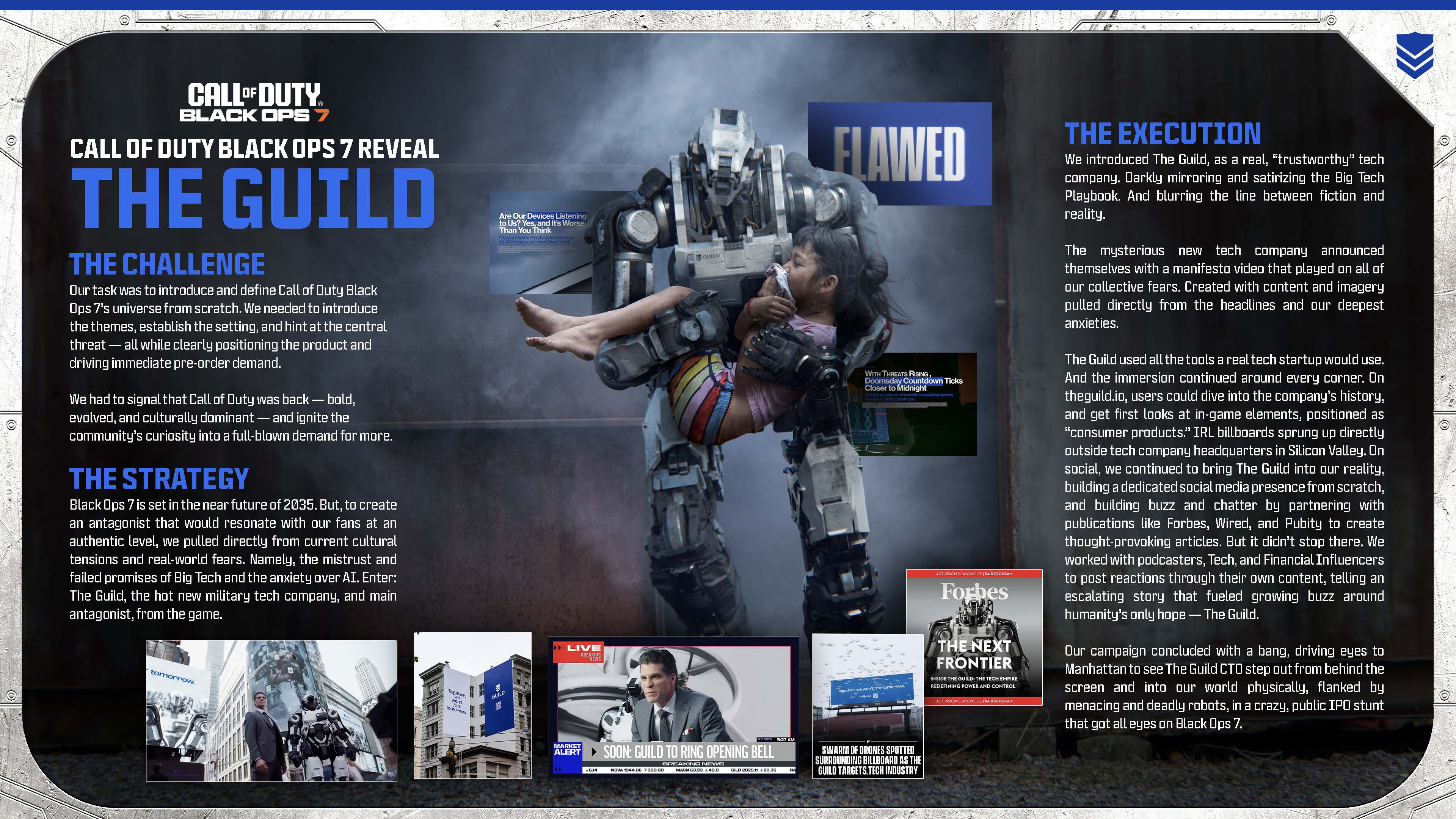 Our campaign concluded with a bang, driving eyes to Manhattan to see The Guild CTO step out from behind the screen and into our world physically, flanked by menacing and deadly robots, in a crazy, public IPO stunt that got all eyes on Black Ops 7.
