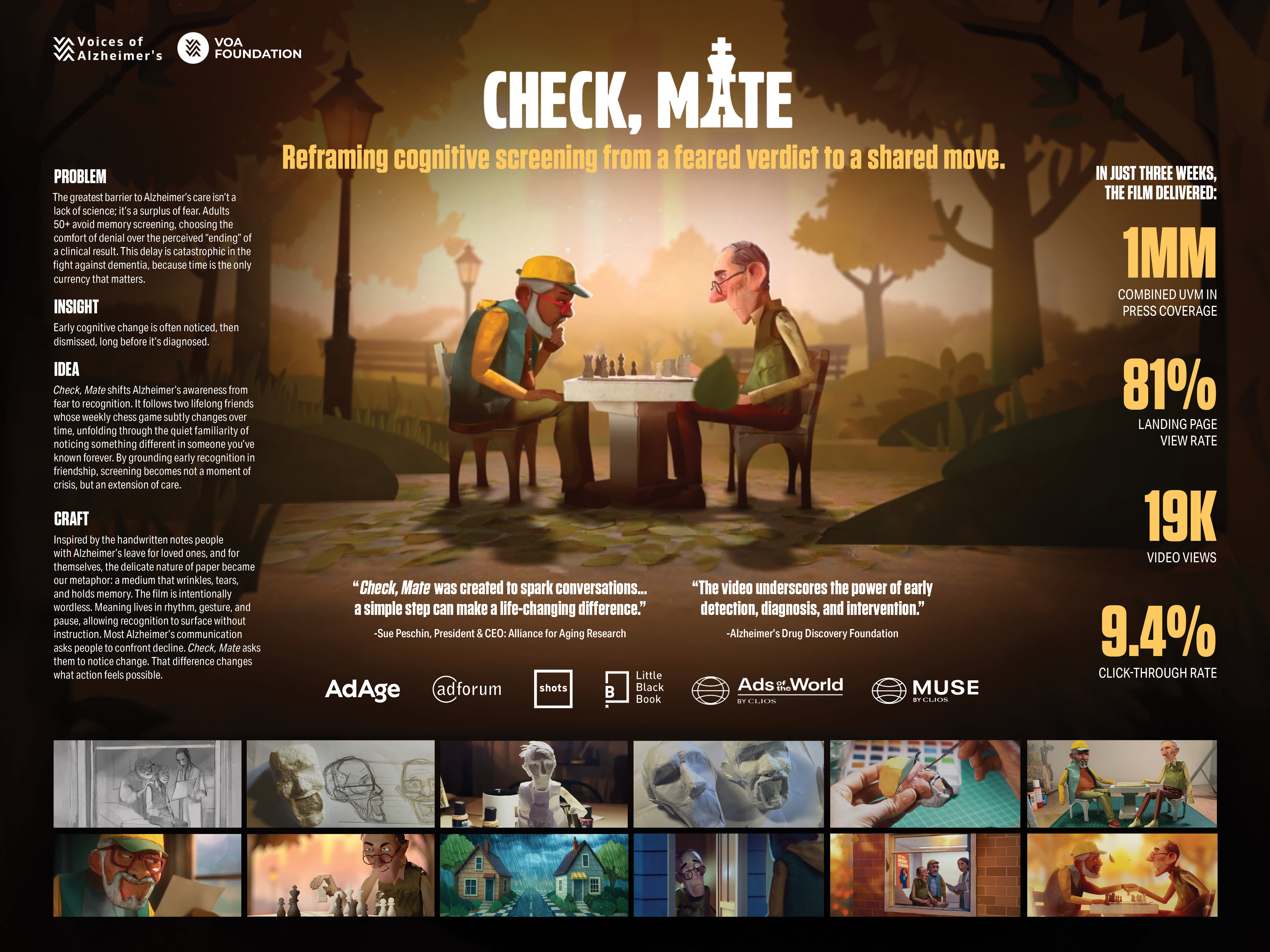 Through a wordless, relationship-centered film, Check, Mate was designed to encourage conversation, recognition, and earlier consideration of screening without telling audiences what to do. The ultimate goal was not immediate action, but a meaningful reframing that could support healthier engagement with Alzheimer’s care over time.