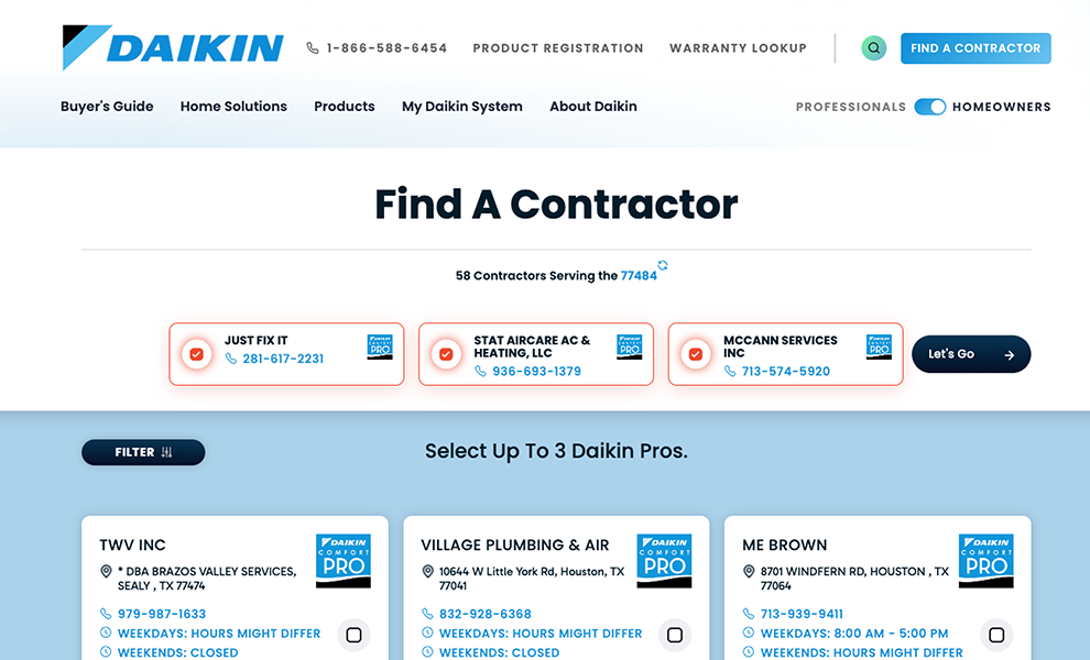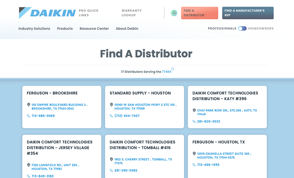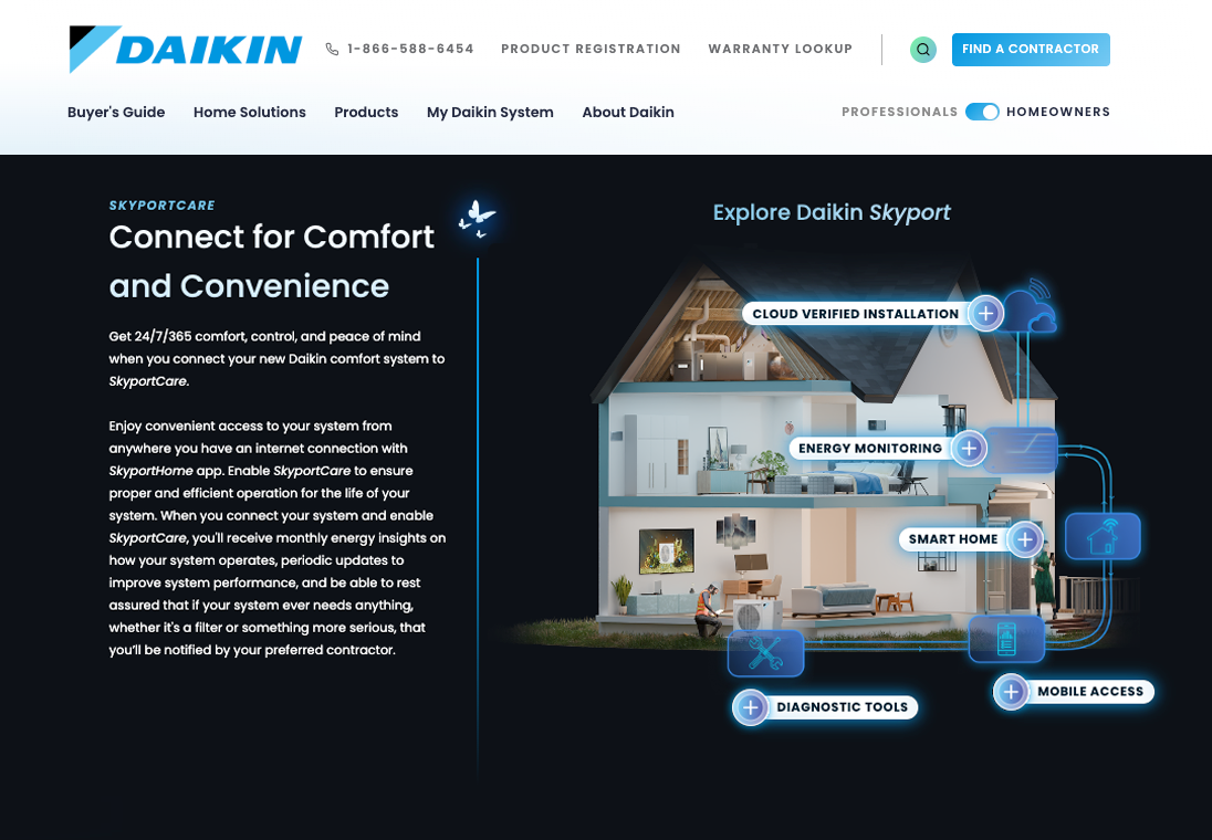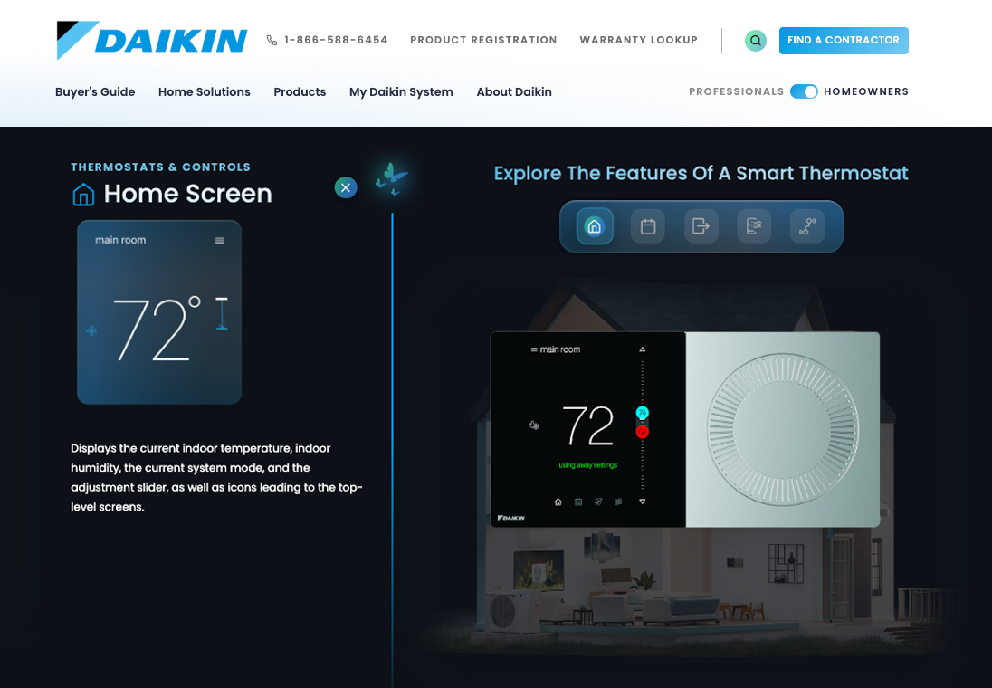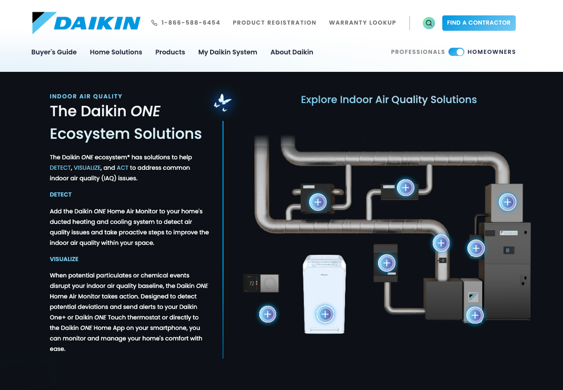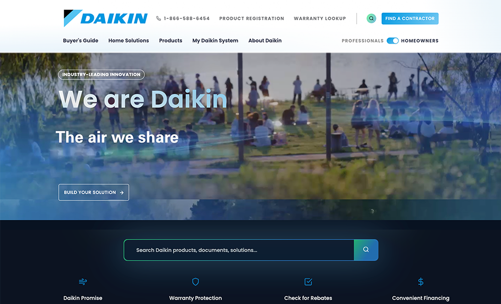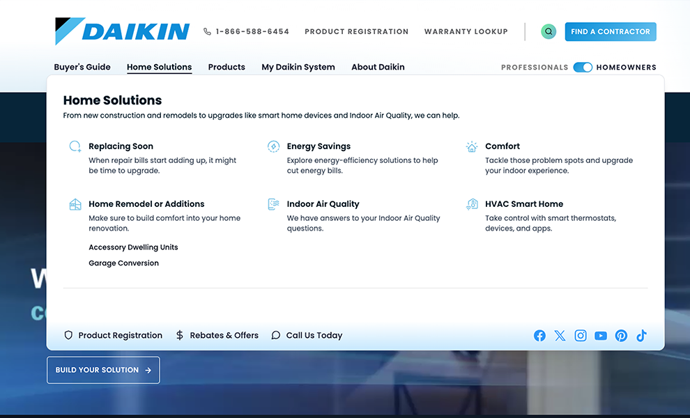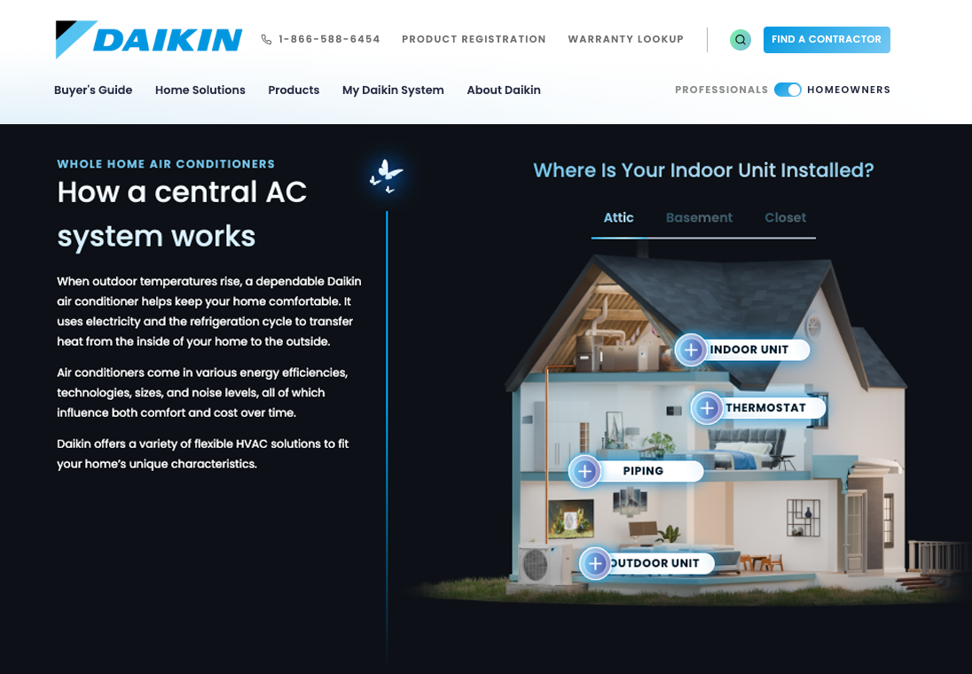 The most transformative shift came with the redesign of the homeowner experience, anchored by an all‑new homeowner homepage. This experience meets users at the intersection of location, behavior, and emotional needs, especially for those just beginning to understand HVAC systems and indoor air quality. By providing an approachable education, contextual pathways, and solution‑specific environments, the new homepage positions Daikin as both a technology leader and a guide in home comfort. It elevates consumer‑friendly language and emotional resonance, giving homeowners the tools to understand products before entering the buying cycle.