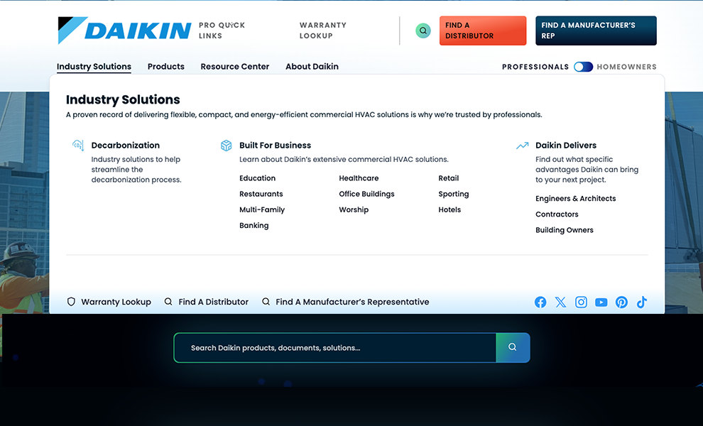 A cornerstone of this evolution was a complete reorganization of the site’s structure. By merging Daikin’s Homeowner and Professional websites, we created a unified DaikinComfort.com that still delivers distinct, audience‑specific paths. Content is segmented to meet visitors where they are, whether seeking product education, professional tools, or solutions tailored to their home or business. The new information architecture preserves hard‑earned SEO value while introducing a more intuitive header and navigation system, recategorizing pages around consumer‑centric solutions, and strengthening brand voice across the experience. The result is simplified navigation, clearer user control, and improved accessibility across every touchpoint.