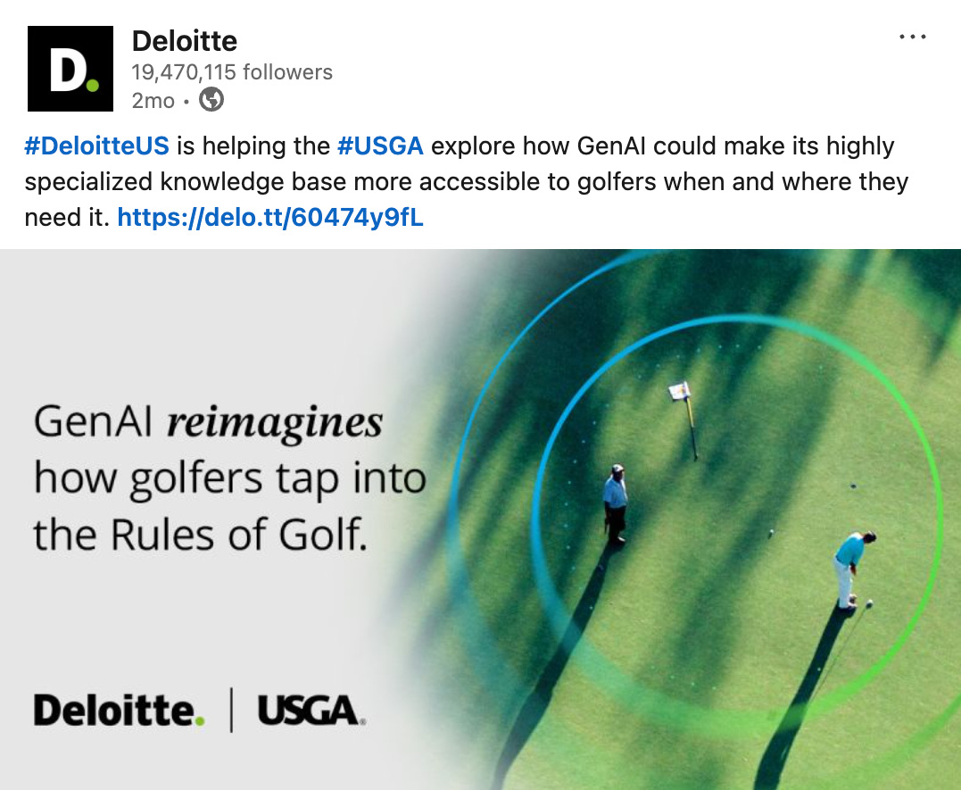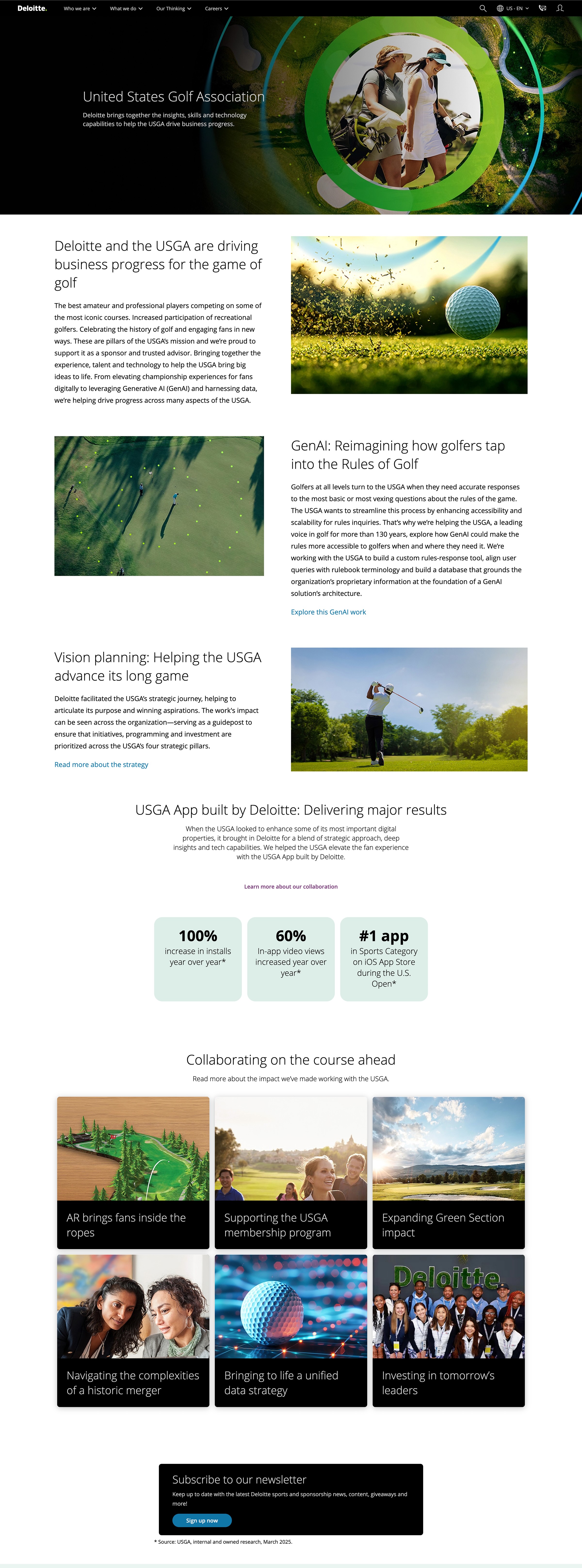 Leveraging Deloitte’s strong business relationship and sponsorship of the United States Golf Association (USGA), we launched a high-impact integrated campaign to elevate our brand, showcase our AI capabilities and demonstrate the value we bring to clients.