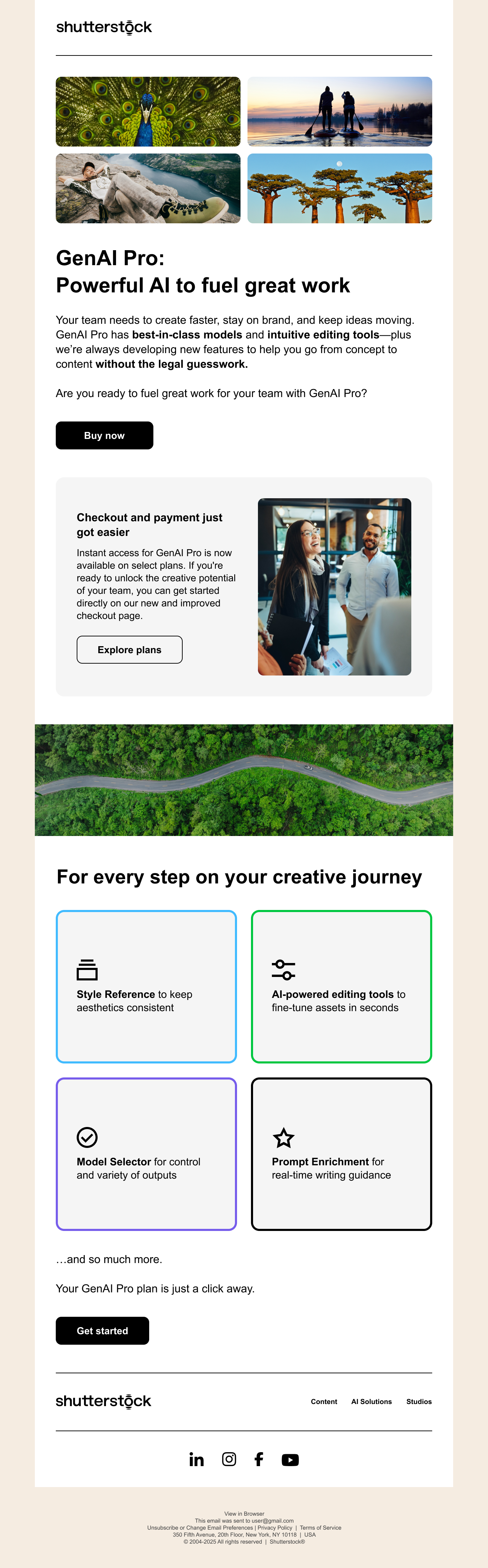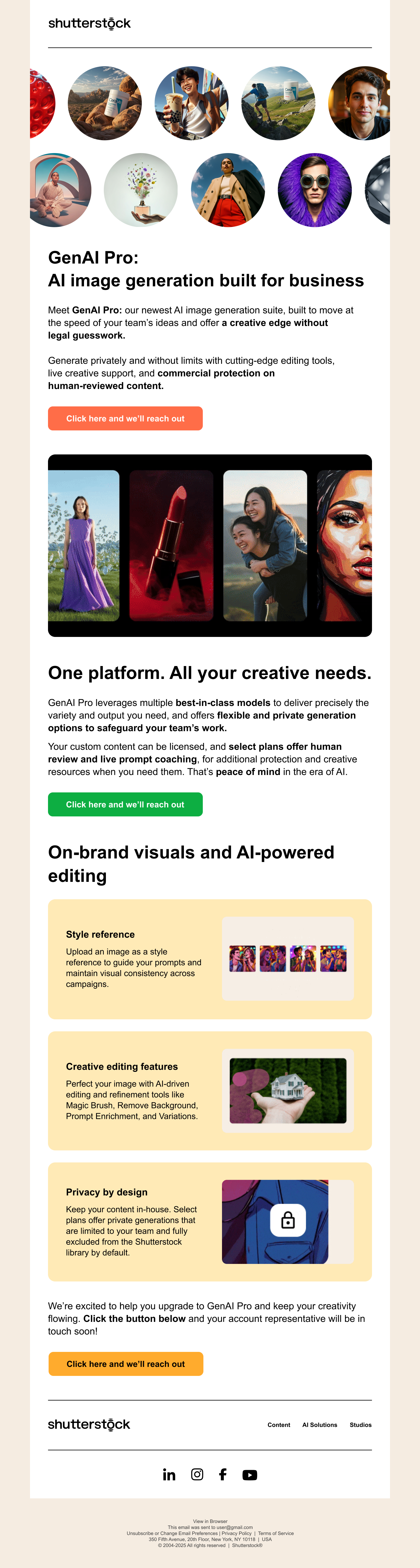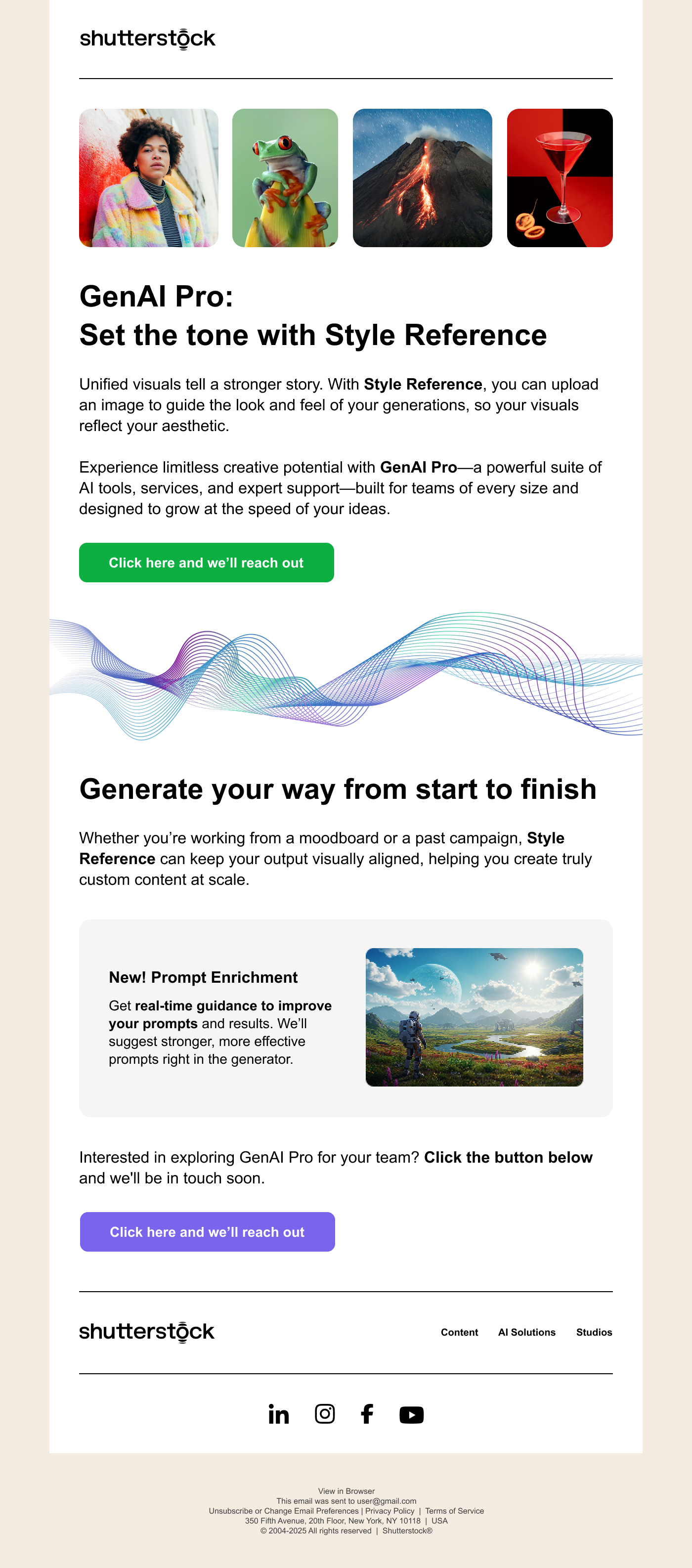 We brought this vision to life with an eight-part email journey that mirrored the customer’s decision-making process. Starting broadly, we then drilled into the features that truly set GenAI Pro apart. Our product provides the latest AI models in a continually updated aggregator, along with business-ready protections and intuitive tools: style reference for unified visuals, private generations for secure workflows, and human review—where customers can send assets for approval before licensing, giving users unmatched peace of mind.