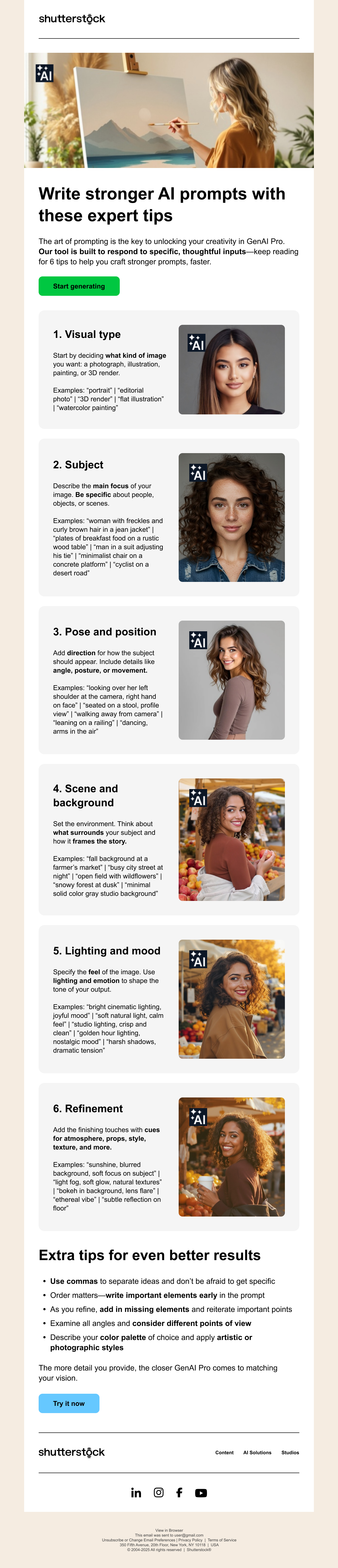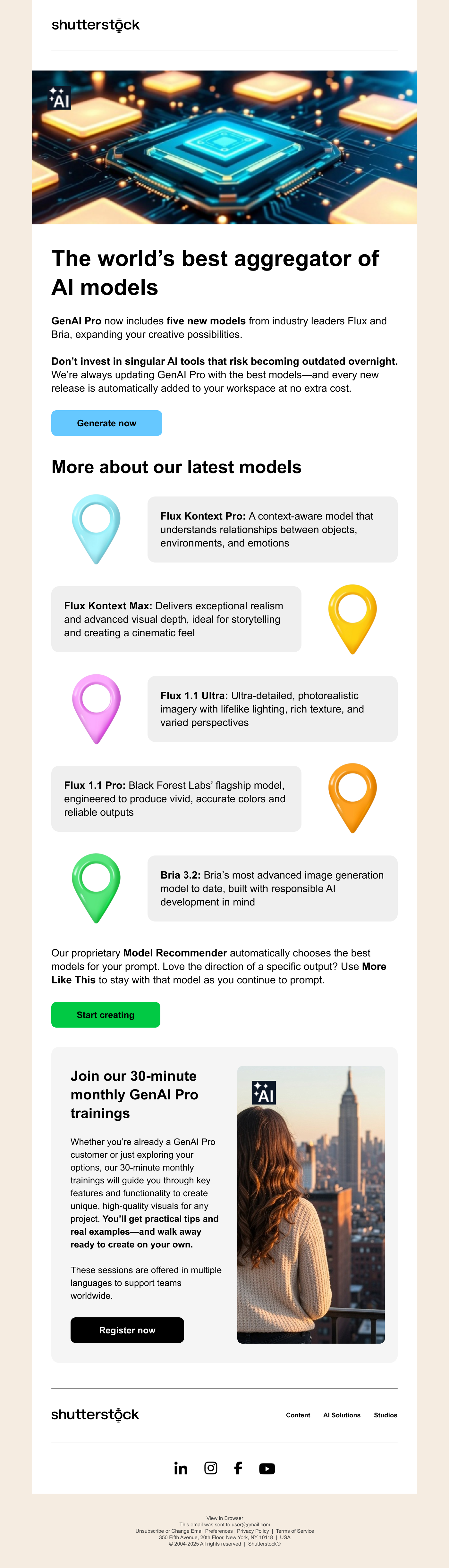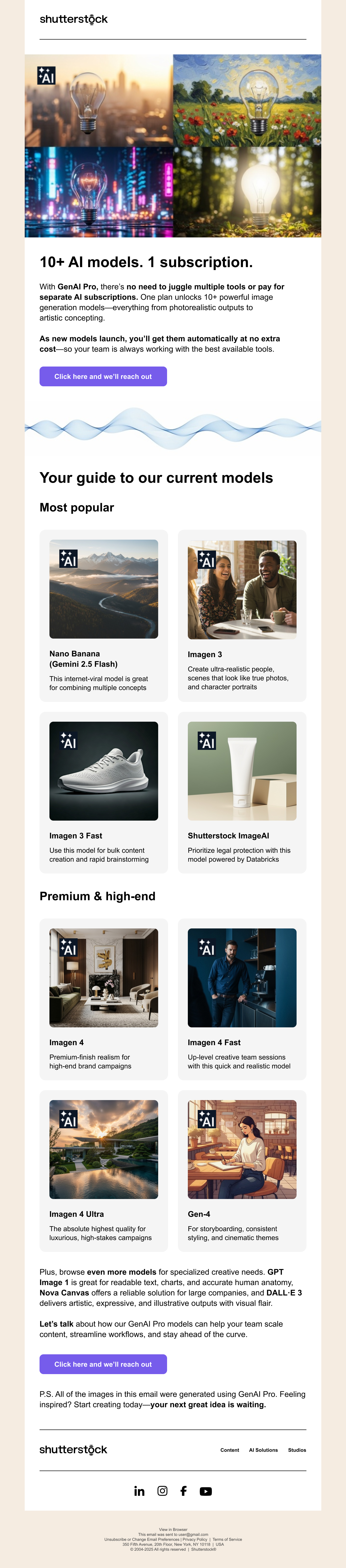 We brought this vision to life with an eight-part email journey that mirrored the customer’s decision-making process. Starting broadly, we then drilled into the features that truly set GenAI Pro apart. Our product provides the latest AI models in a continually updated aggregator, along with business-ready protections and intuitive tools: style reference for unified visuals, private generations for secure workflows, and human review—where customers can send assets for approval before licensing, giving users unmatched peace of mind.