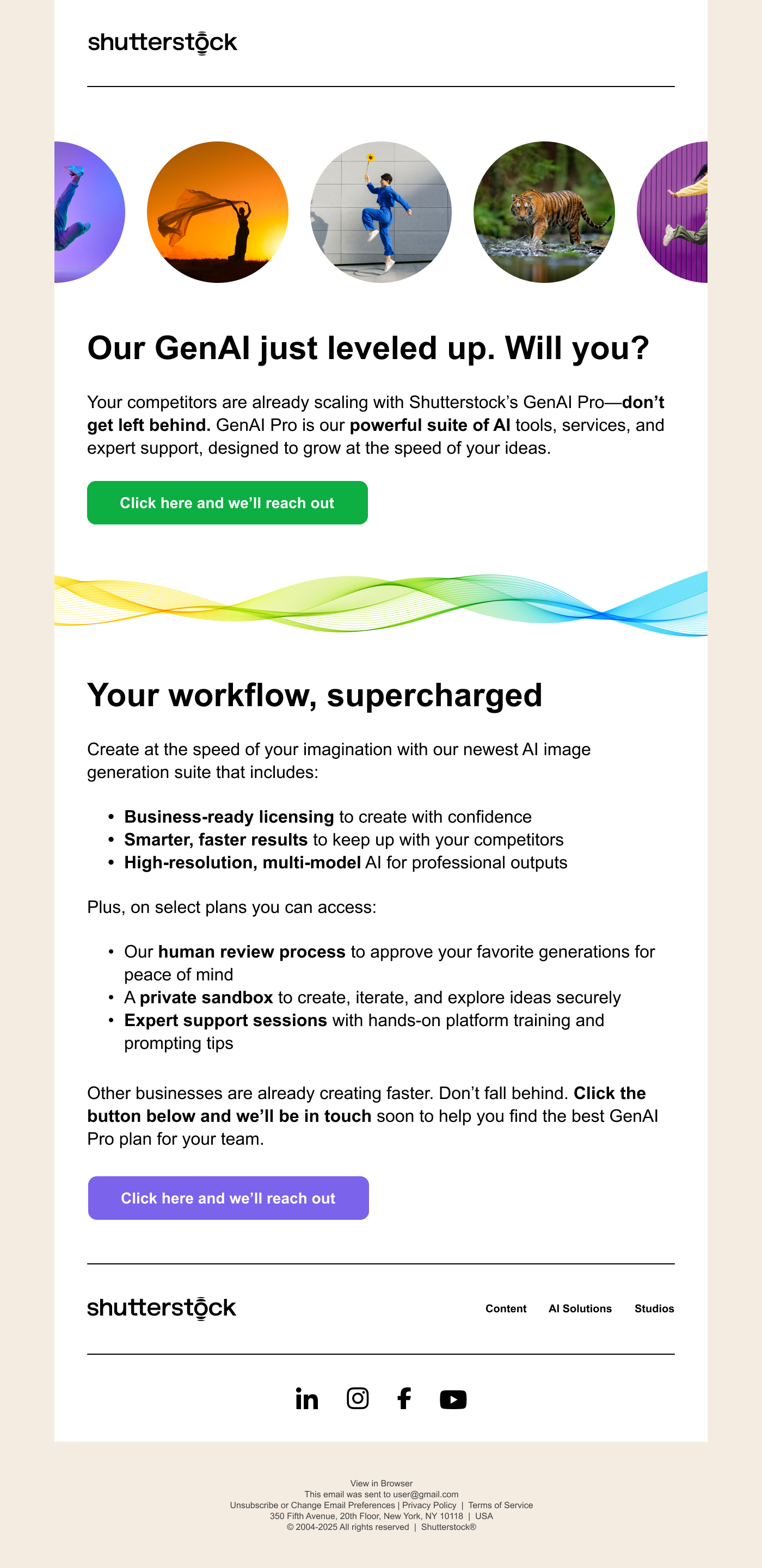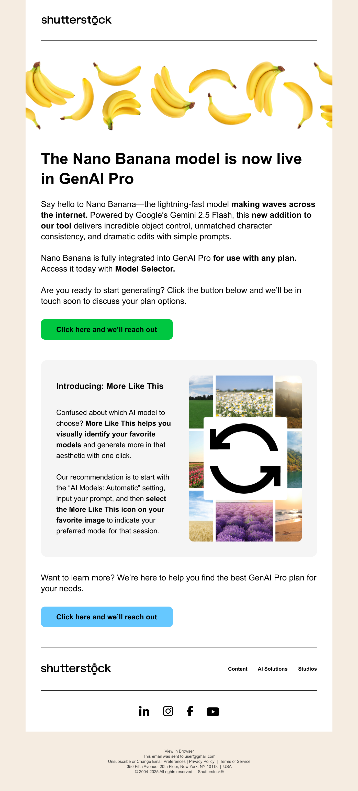 The other major challenge we faced was timing. AI tools across the market are evolving rapidly, along with daily engineering advancements in our own tool. Our emails had to keep pace without losing clarity or consistency. To navigate this challenge, we prioritized communicating both excitement and reassurance, positioning Shutterstock as a trusted B2B AI partner in a crowded, hype-driven market.
