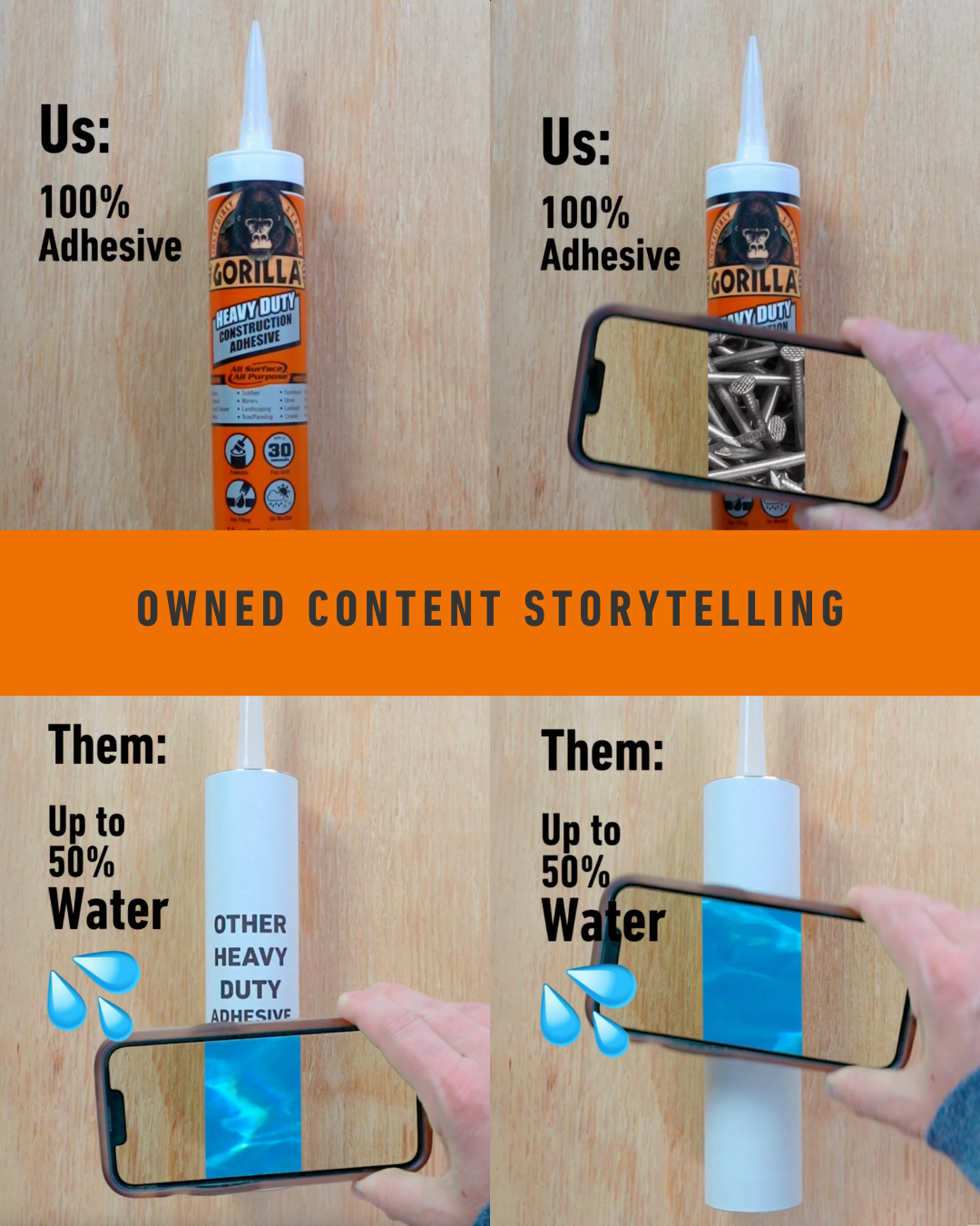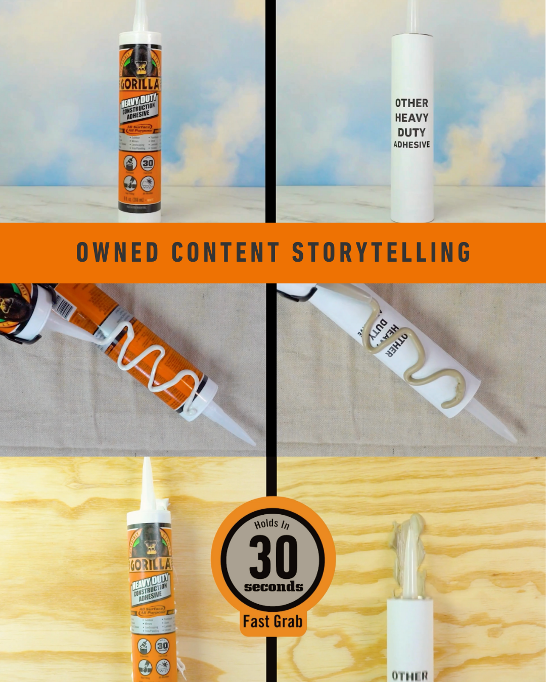 One of the key challenges was breaking through long-held perceptions in a category dominated by familiar competitors. By anchoring the campaign in authentic demonstrations and performance proof, we overcame skepticism and repositioned Gorilla Glue Heavy-Duty Construction Adhesive as a professional-grade solution worthy of consideration on the jobsite.