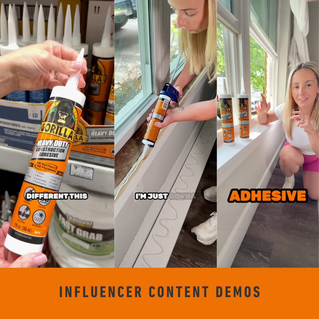 We activated a coordinated mix of owned, paid, and influencer content, ensuring consistent brand signals across platforms while tailoring execution to each channel’s strengths. Influencer partnerships played a critical role in reinforcing credibility, as trusted trade voices demonstrated the product in real-world applications, helping Pros see Gorilla Glue as a reliable solution rather than a consumer-only brand.