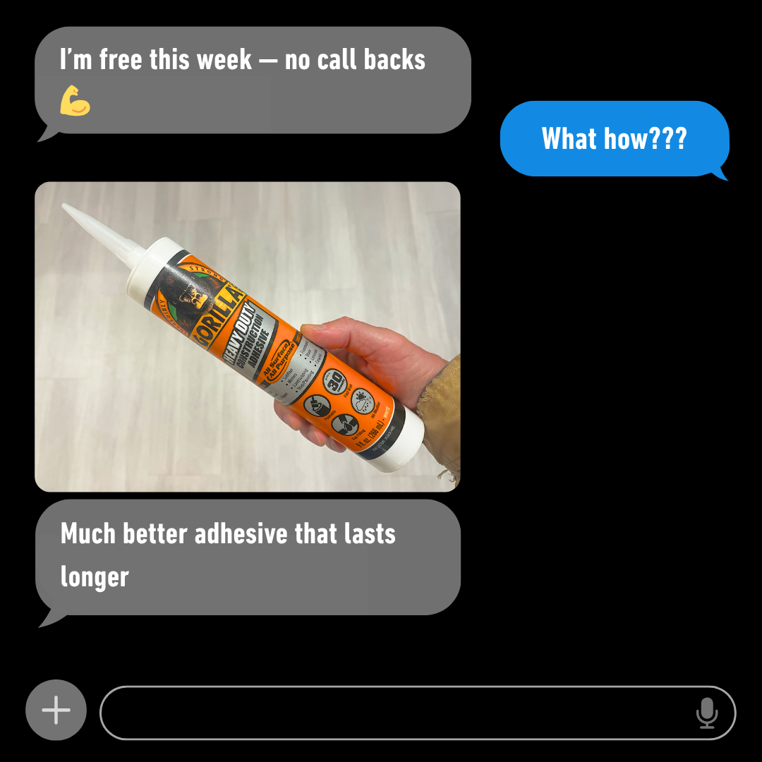 Our objective was to close this awareness gap by repositioning Gorilla Glue Heavy-Duty Construction Adhesive as a go-to solution for Pros, elevating brand recognition and recall within key trade markets. The campaign aimed to establish clear differentiation by spotlighting performance-driven benefits that matter most to professionals, including its “no call backs” reliability and its 100 percent adhesive formula, unlike competitor products diluted with water.