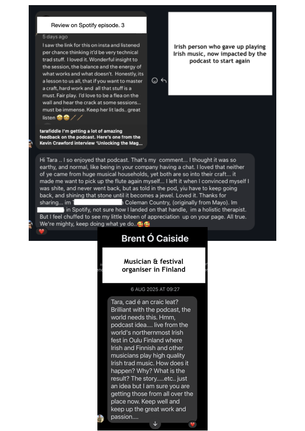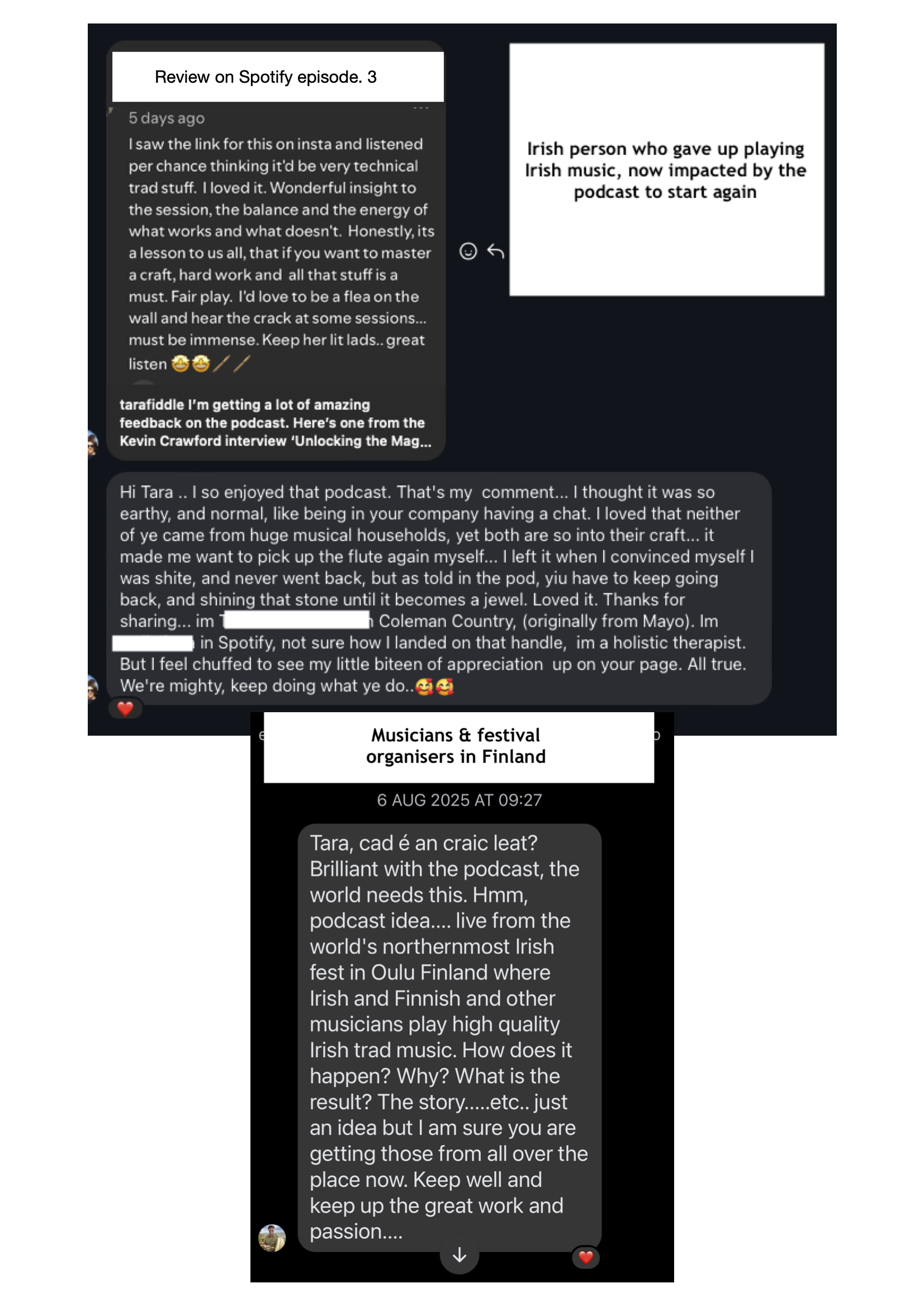 The project was launched from an existing position of trust. As an Irish traditional musician who has performed internationally for over three decades, the host drew initially on a personal network of approximately 5,000 musicians, organisers, and cultural practitioners across socials without any paid advertising. This ensured early visibility within the global Irish music community and positioned the podcast immediately as an insider-led conversation rather than an external critique.
