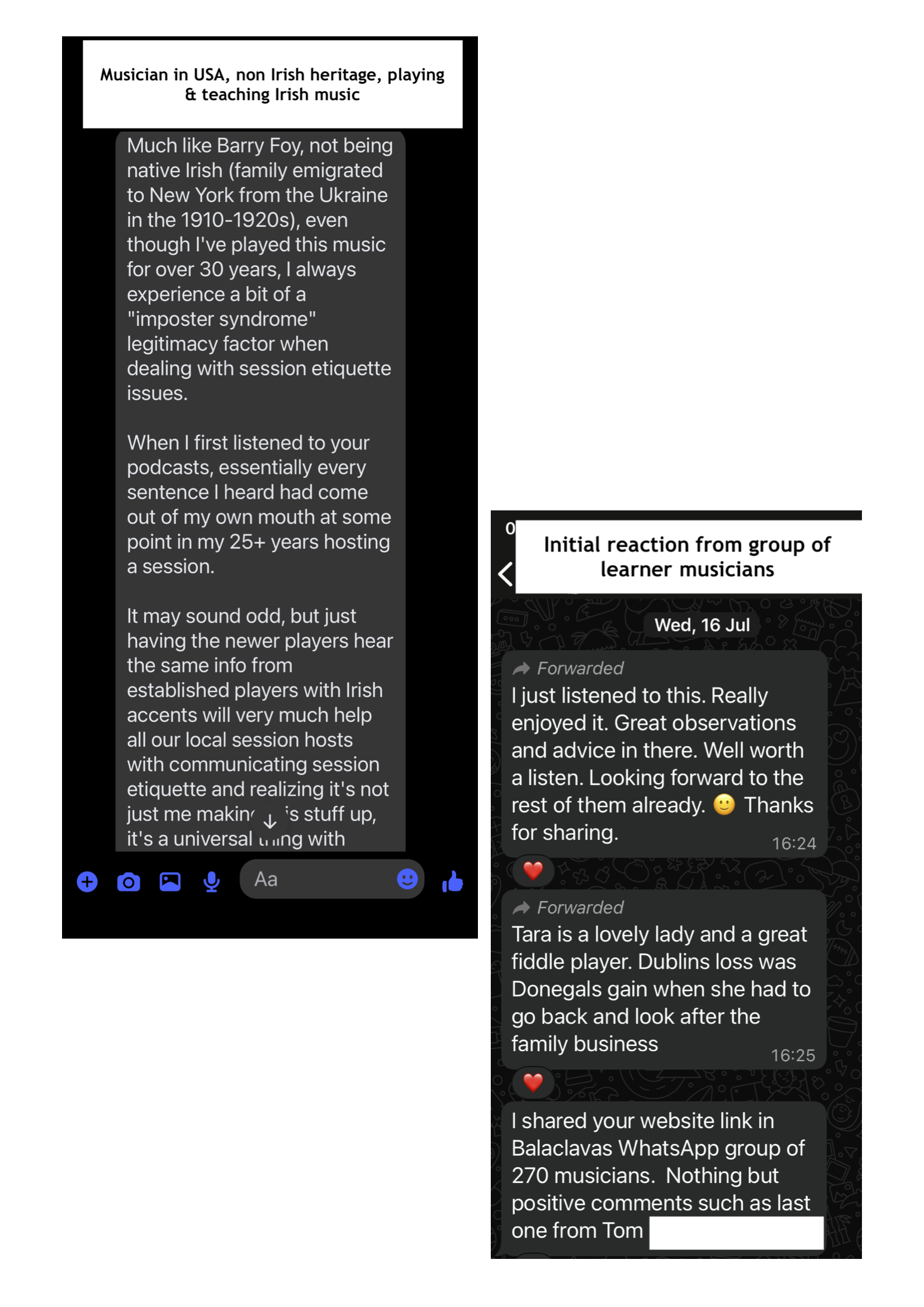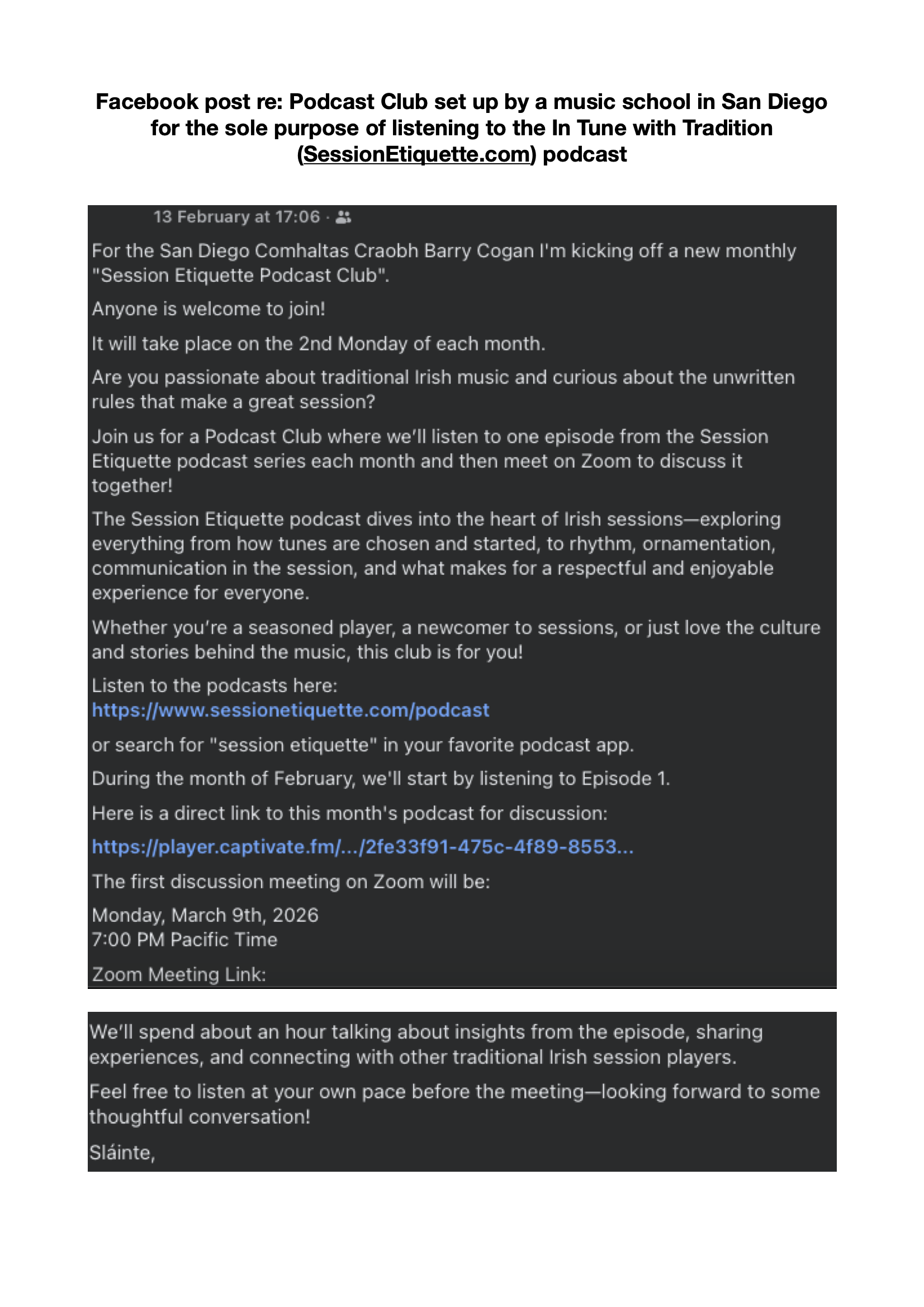The podcast reframes etiquette not as enforcement, but as care, for the music, for the group, and for the continuity of the tradition. Listeners frequently cite moments of clarity, helping them understand experiences they had struggled to interpret for years. One of the most impactful episodes, Unlocking the Magic of an Irish Music Session, features Kevin Crawford where the intangible elements that create “magic” in sessions were deconstructed, validating lived experience while also offering guidance grounded in respect.