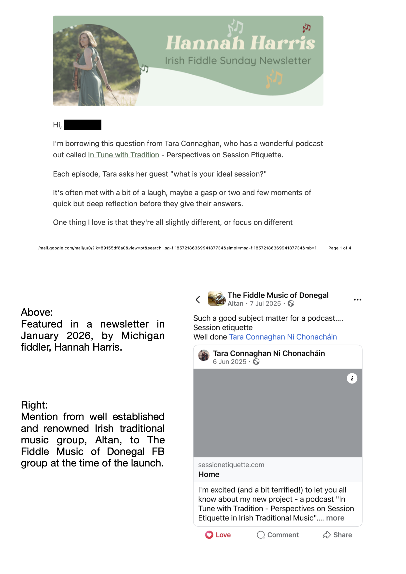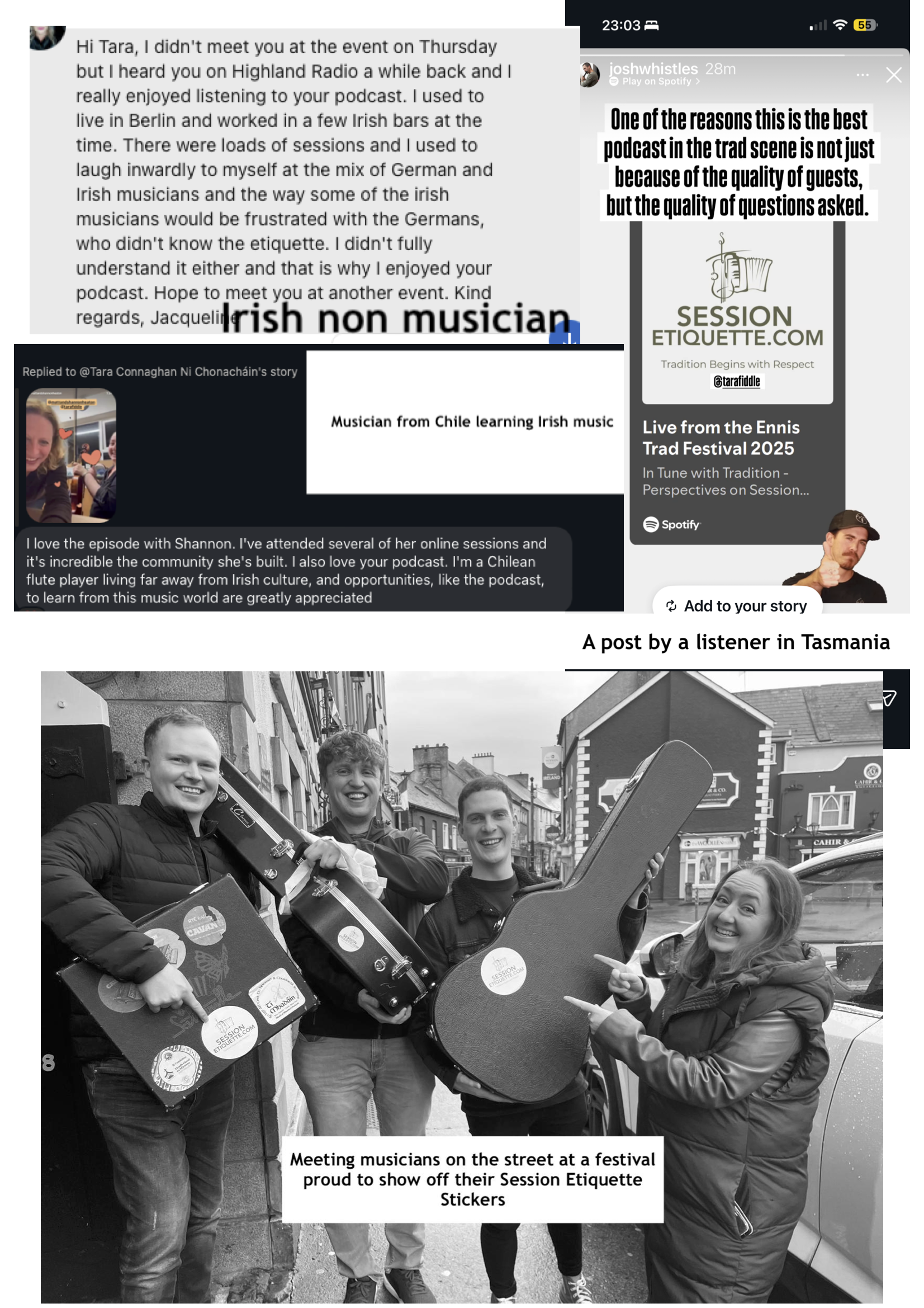Offline, the project has been supported through simple, culture-specific visibility rather than traditional promotion. SessionEtiquette.com stickers were produced for the launch and distributed directly to listeners in response to social media engagement. Within Irish music culture, instrument cases function as informal noticeboards, particularly at festivals, allowing the project to travel organically through peer-to-peer visibility.