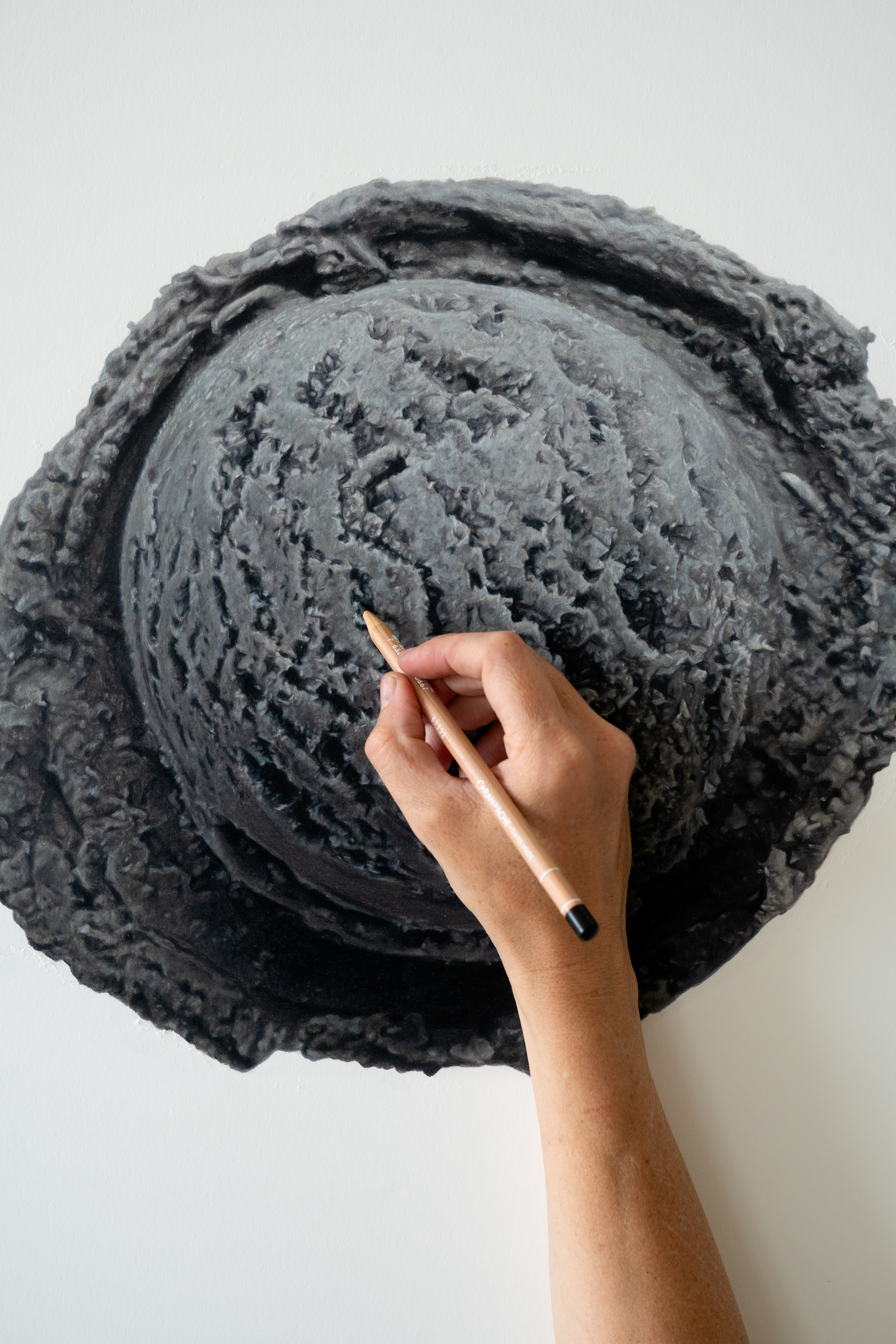 The drawing was on display at a three-day pop-up ice cream shop in NYC. Hendry, known for immersive installations that challenge traditional boundaries between art and audience and transform passive observation into active participation, created a completely monochromatic shop to bring the flavor to life. As with the ice cream itself, the pop-up shop was devoid of color, but as it unfolded, so too did the nuances of the space and the artwork.