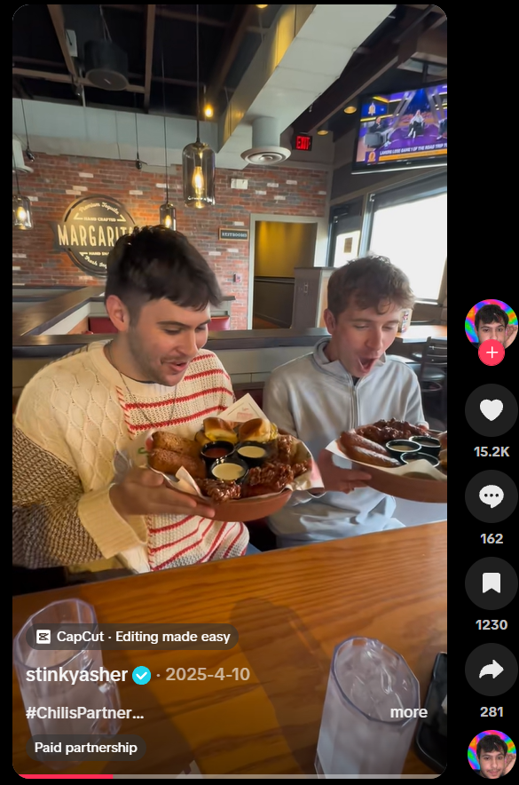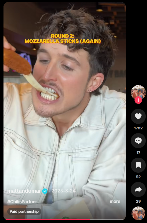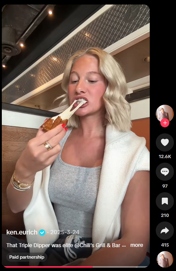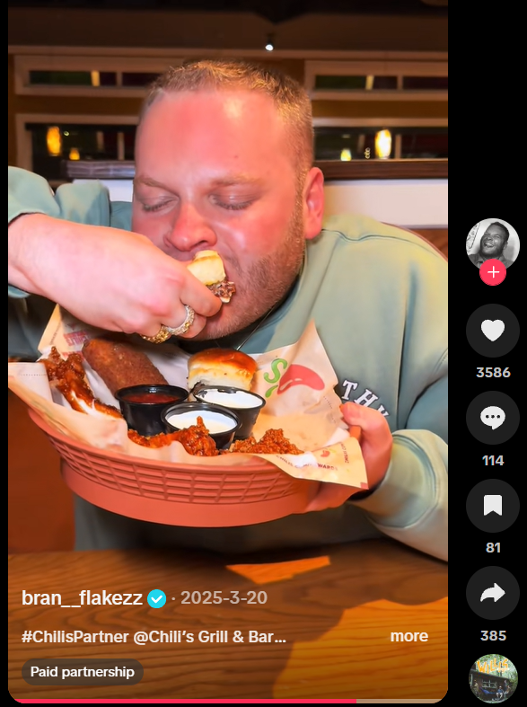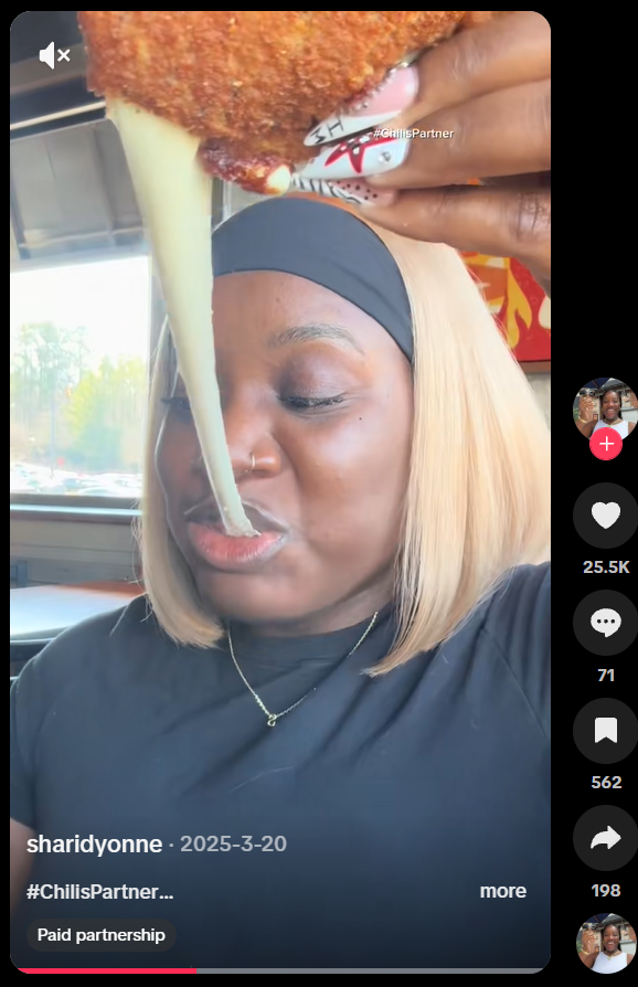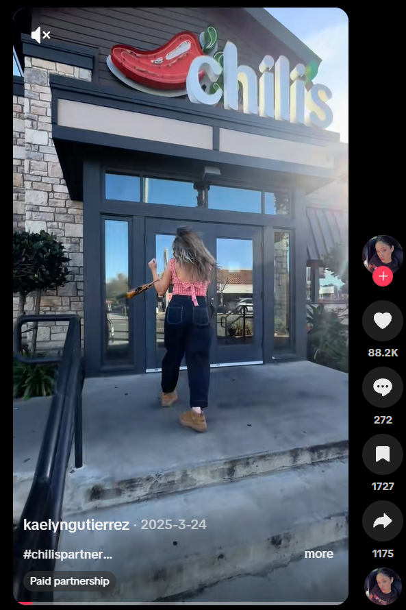 Chili’s shines when highlighting the social and authentic side of dining, whereas many casual dining brands often approach creator marketing like traditional media buying, for example: “Here’s the menu item,” “Say the brand name 3 times,” “Post at 6 PM on Tuesday.” These campaigns show food, but rarely show why people choose the brand in real life. The risk is that creators feel like ad space instead of collaborators, and content lands flat.