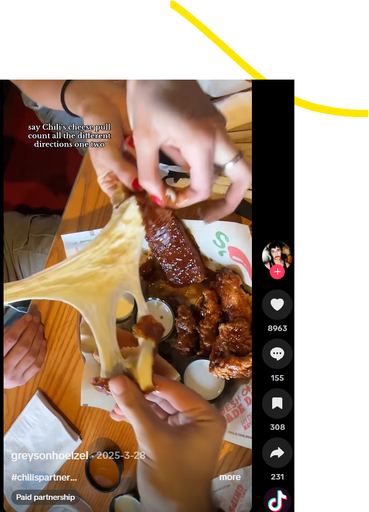 The real value of the Triple Dipper isn’t the appetizer combination, it’s what the platter creates: a shared, playful, group-friendly experience. Instead of framing the content as “Let’s promote an appetizer,” Chili’s and Influencer wanted to capture the social experience of a Triple Dipper. This unlocked content rooted in emotion and story which is what TikTok actually rewards.