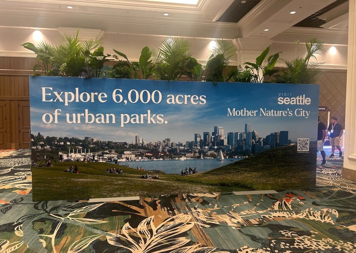 At major trade shows, Visit Seattle replaced traditional booths with walkable environments featuring living greenery walls and nature-forward installations—bringing the outdoors into convention halls. At a Travel + Leisure industry event, we extended the idea further by transforming the space into a “coffee break in nature,” complete with Pacific Northwest scenery and seed paper, allowing attendees to literally take a piece of the brand home with them.