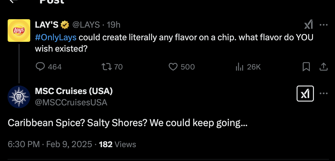 On Super Bowl Sunday itself, MSC Cruises and Socialfly operated as a unified, onsite team at the brands HQ, focused on real-time cultural engagement. Across Instagram, Facebook, TikTok, and X, the team reacted live to gameplay, participated in trending conversations, and engaged directly with other major advertisers through smart replies, custom memes, and precisely timed content drops.