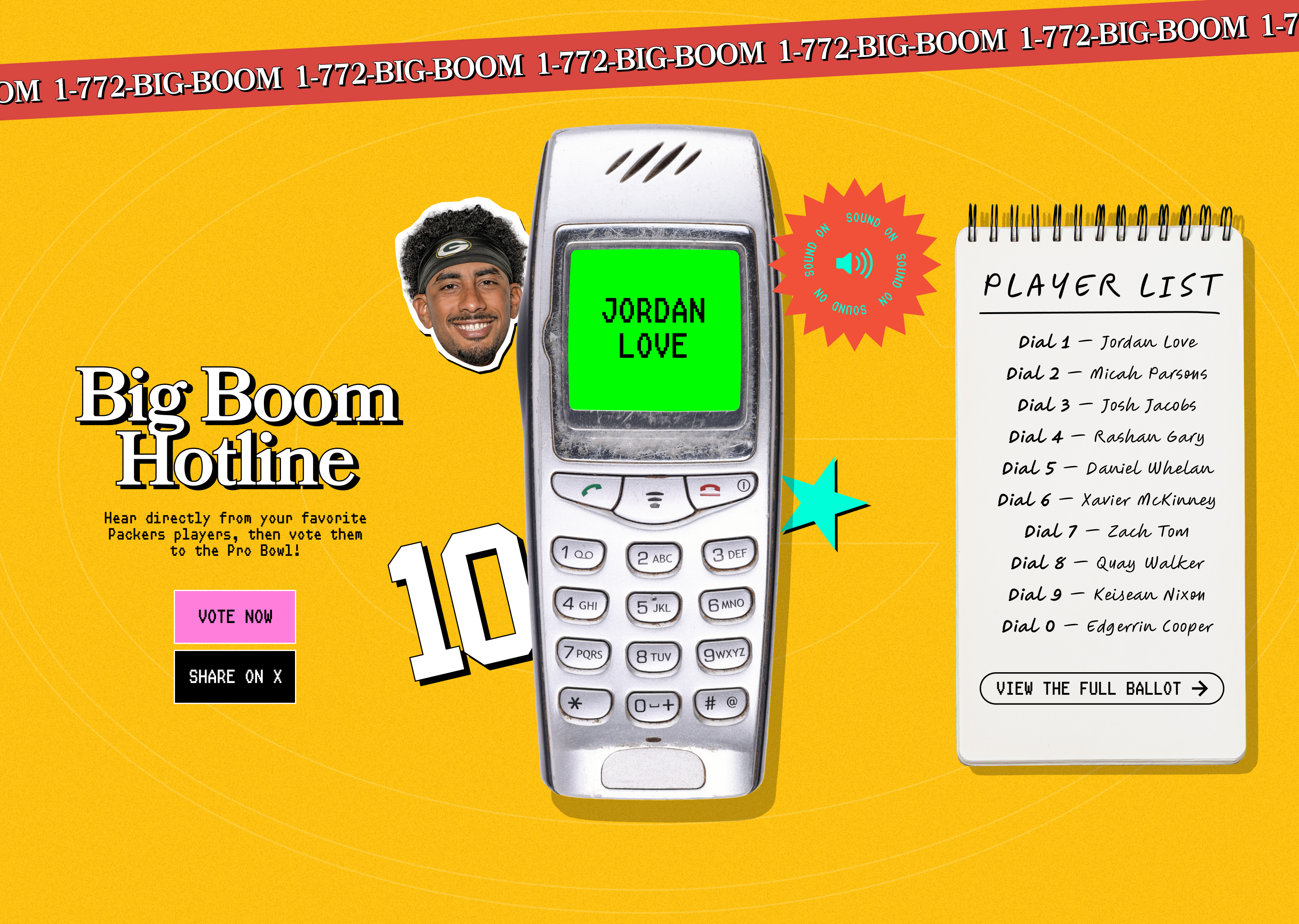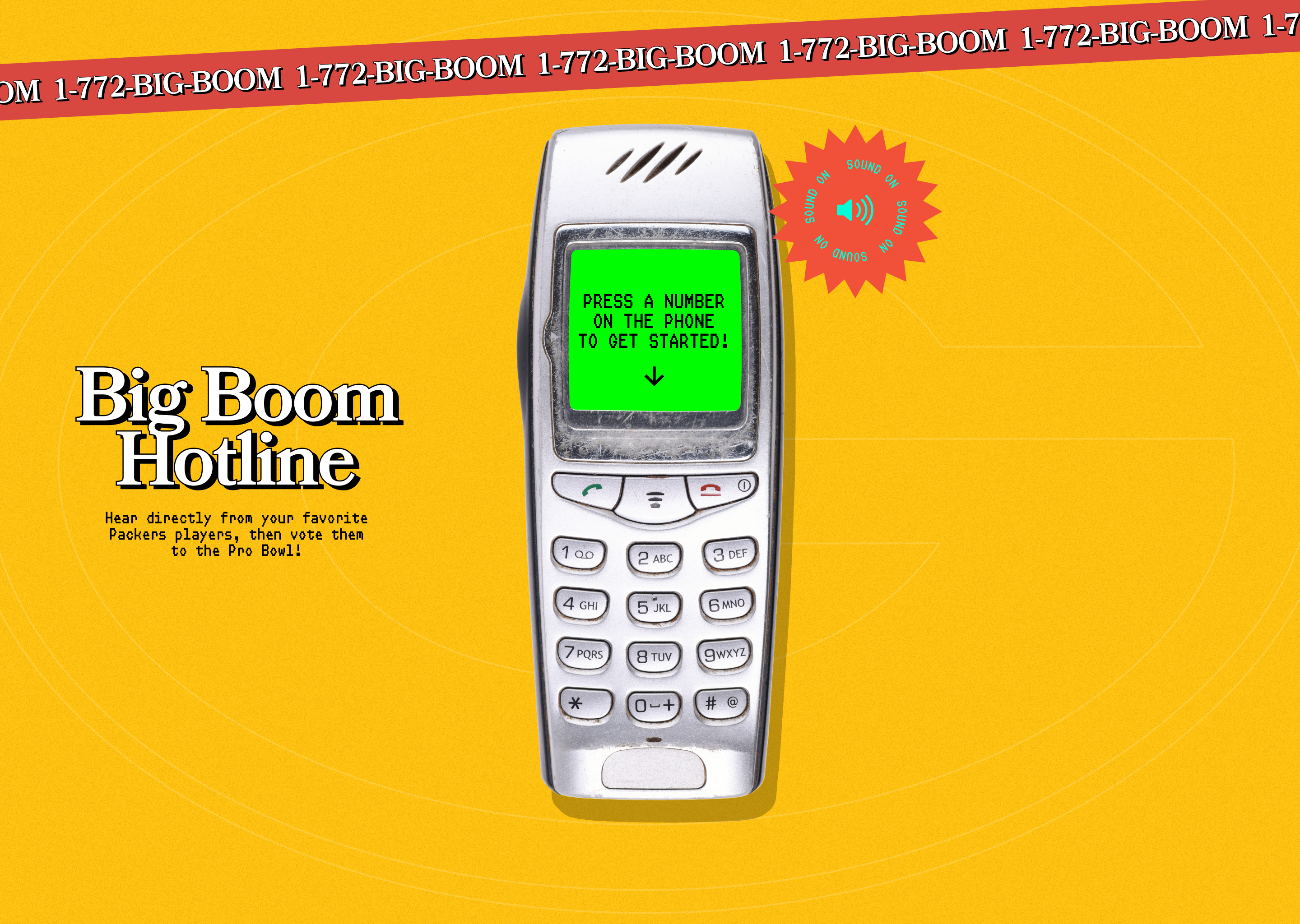 The Big Boom Hotline – Pro Bowl Stunt was driven by the idea that Pro Bowl voting could be transformed into an interactive fan experience built for how modern sports audiences engage. The campaign introduced a real, functioning phone hotline where fans could call in to hear custom messages from Green Bay Packers players and leave voicemails of their own, supported by platform-native social content across Instagram, TikTok, Facebook, and X. A custom microsite extended the experience digitally, creating a seamless connection between participation and Pro Bowl voting.