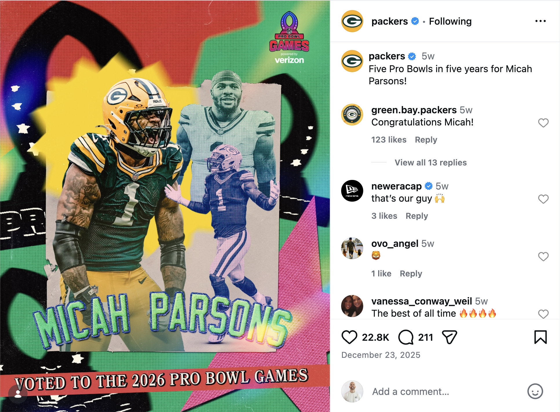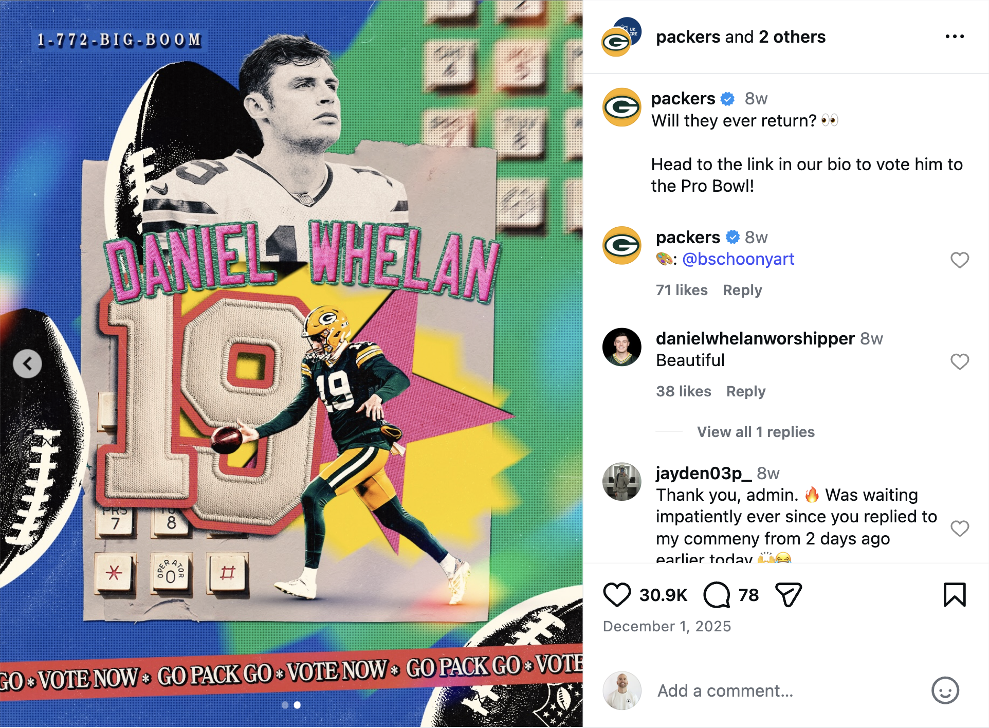 The campaign also drove audience growth during a key league moment. From November 27 - December 15, the Packers added 16.2K Instagram followers, a 107% increase compared to the prior period, while Facebook added 11.2K followers, representing a 112% increase.
