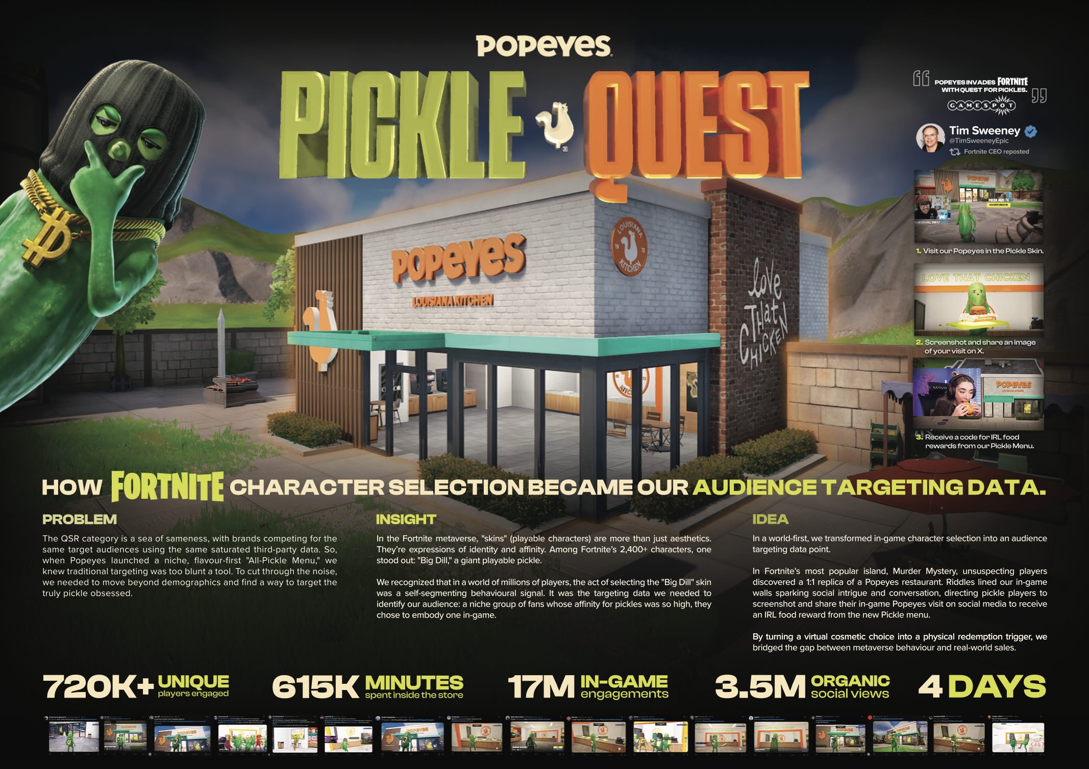Industry First: We proved that the future of targeting lies in creatively leveraging unique behavioral signals that already exist in interactive digital environments. By treating in-game character selection as a unique data point, we unlocked a specific audience based on their real pickle passion.