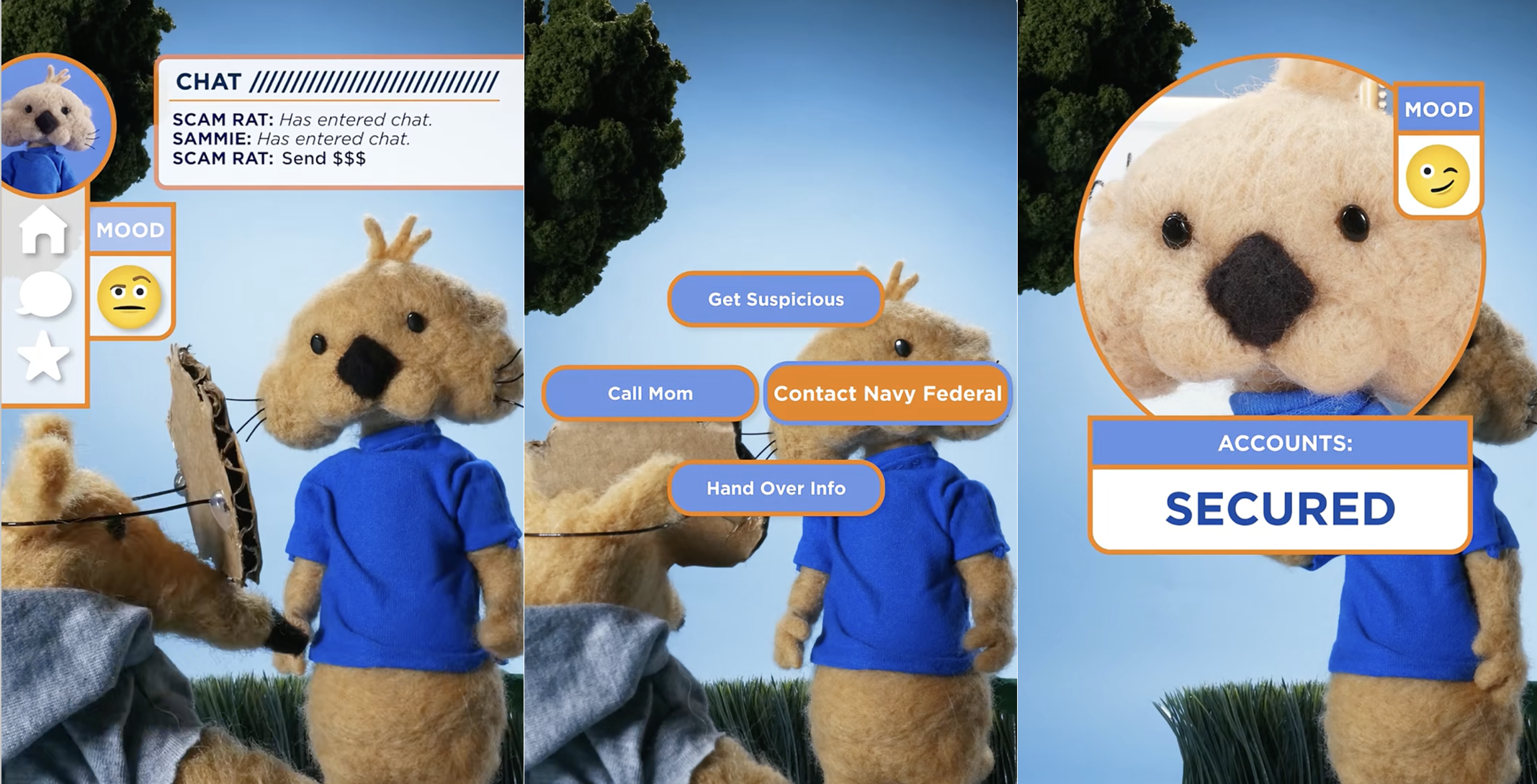 To infuse creativity and more gaming elements in video, Sammie was reimagined as a felt puppet in stop-motion videos. Sammie gears up with security upgrades and can be seen running, collecting coins and dodging scam boxes. This journey mirrors how members can “level up” their own account security with Navy Federal as their Partner in Security. Branded elements were woven in by adding logos on containers and the globe at the final checkpoint, creating a story-driven experience.