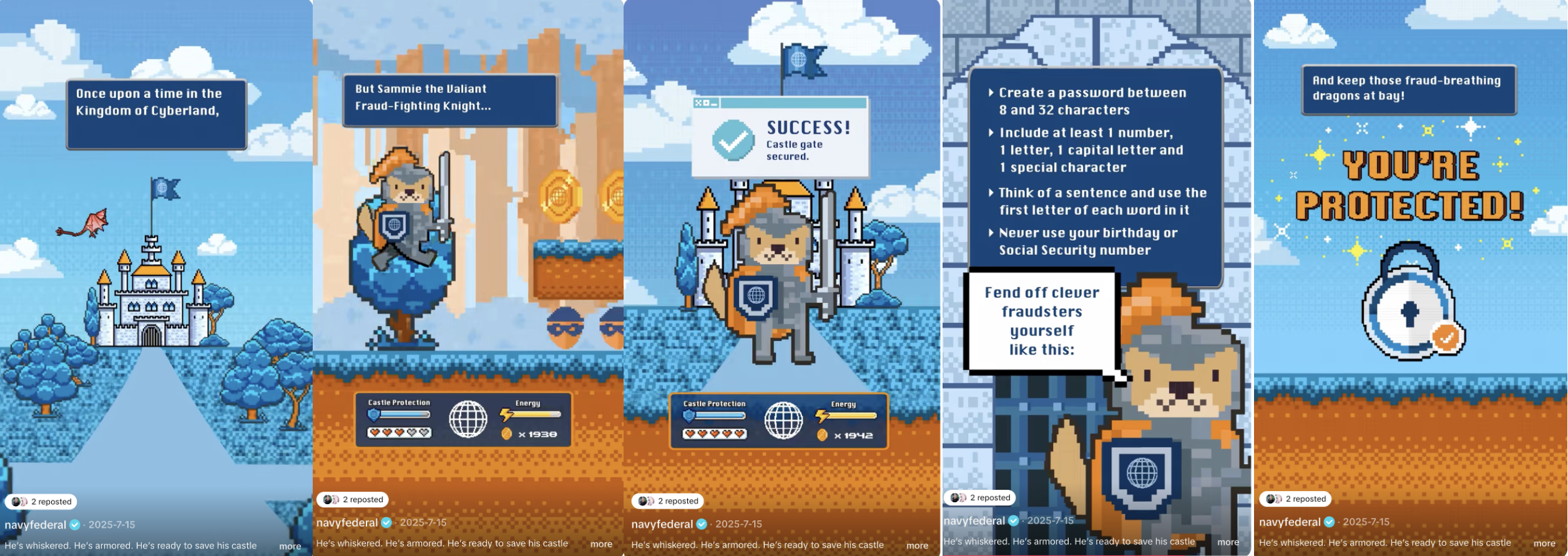 In collaboration with our in-house creative team, we developed a fresh approach to teaching password best practices. To differentiate our messaging, we developed a concept that presents password tips in a more engaging and memorable way. The video has a retro gaming-style format and features Sammie (Navy Federal’s mascot) as a fraud-fighting knight defending the castle with strong passwords.