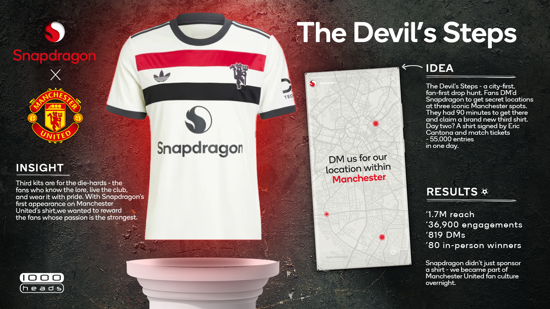 Surprise escalation: giveaway of a signed Eric Cantona shirt, match tickets and third shirts. A single post drove over 50,000 entries, bringing thousands of Man Utd’s local community to Snapdragon’s world.