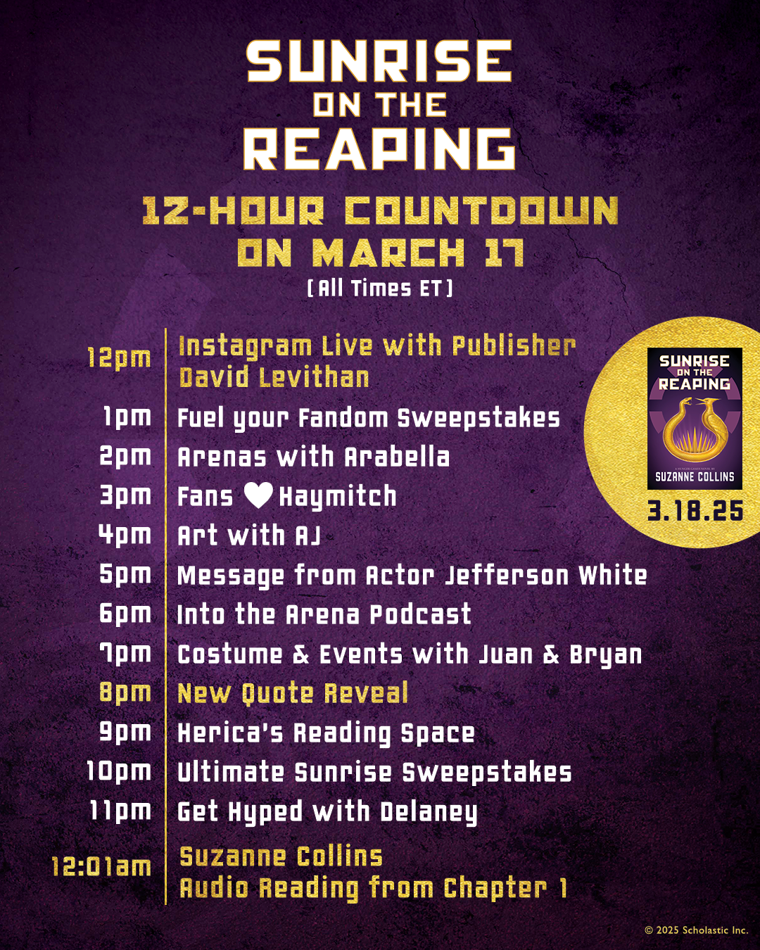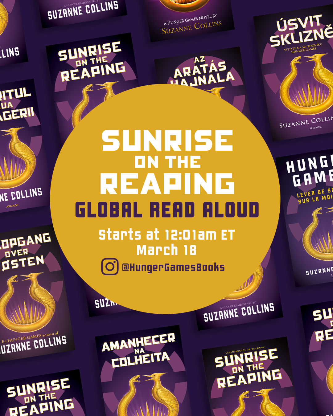 On March 14, Scholastic unveiled the 12-Hour Countdown virtual event schedule for the release of Sunrise on the Reaping, publishing on March 18 worldwide. In addition, the Global Read Aloud was announced, which entailed Hunger Games influencers from around the world reading from the same first chapter excerpt from Sunrise on the Reaping in their own languages. The Global Read Aloud kicked off with a reading from author Suzanne Collins on March 18, 12:01 am ET.