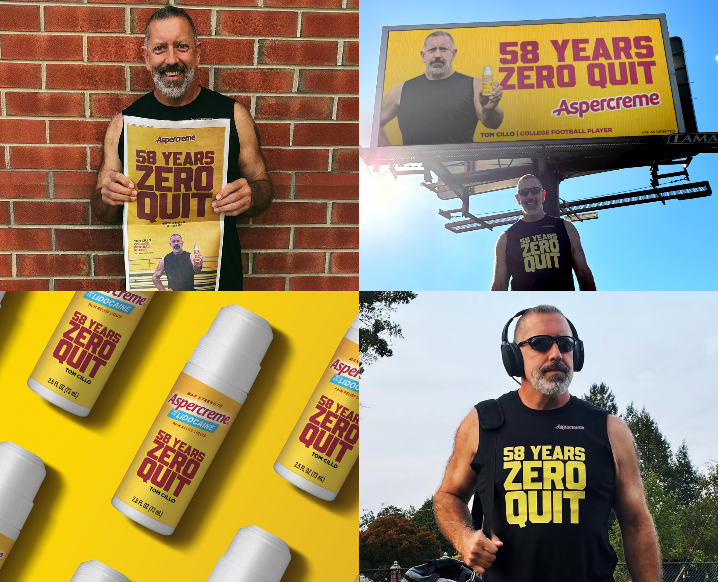 Within five minutes of spotting the opportunity and a quick text to the client, we were in motion. Just a couple of days later, Aspercreme signed Tom to a historic NIL sponsorship deal, making him the oldest ever player to receive one. In our launch video, Tom shared a powerful, defiant voiceover – “You lose something when you age: the ability to give a damn what anyone else thinks” – an unexpected tone that fans immediately latched onto. Not only was Tom facing incredibly physical, painful challenges in his football journey, but he also personified our brand’s ethos, proving that you can defy aging’s stereotypes when you defy pain’s power. So this partnership birthed a simple mantra: “58 Years. 0 Quit.”