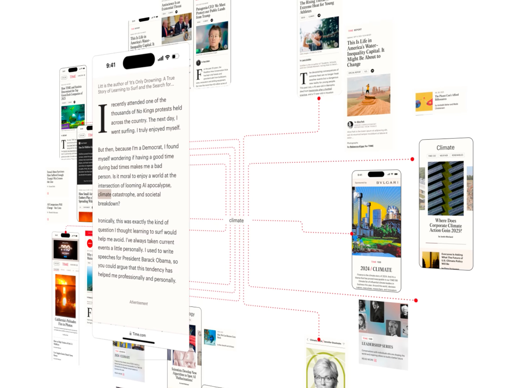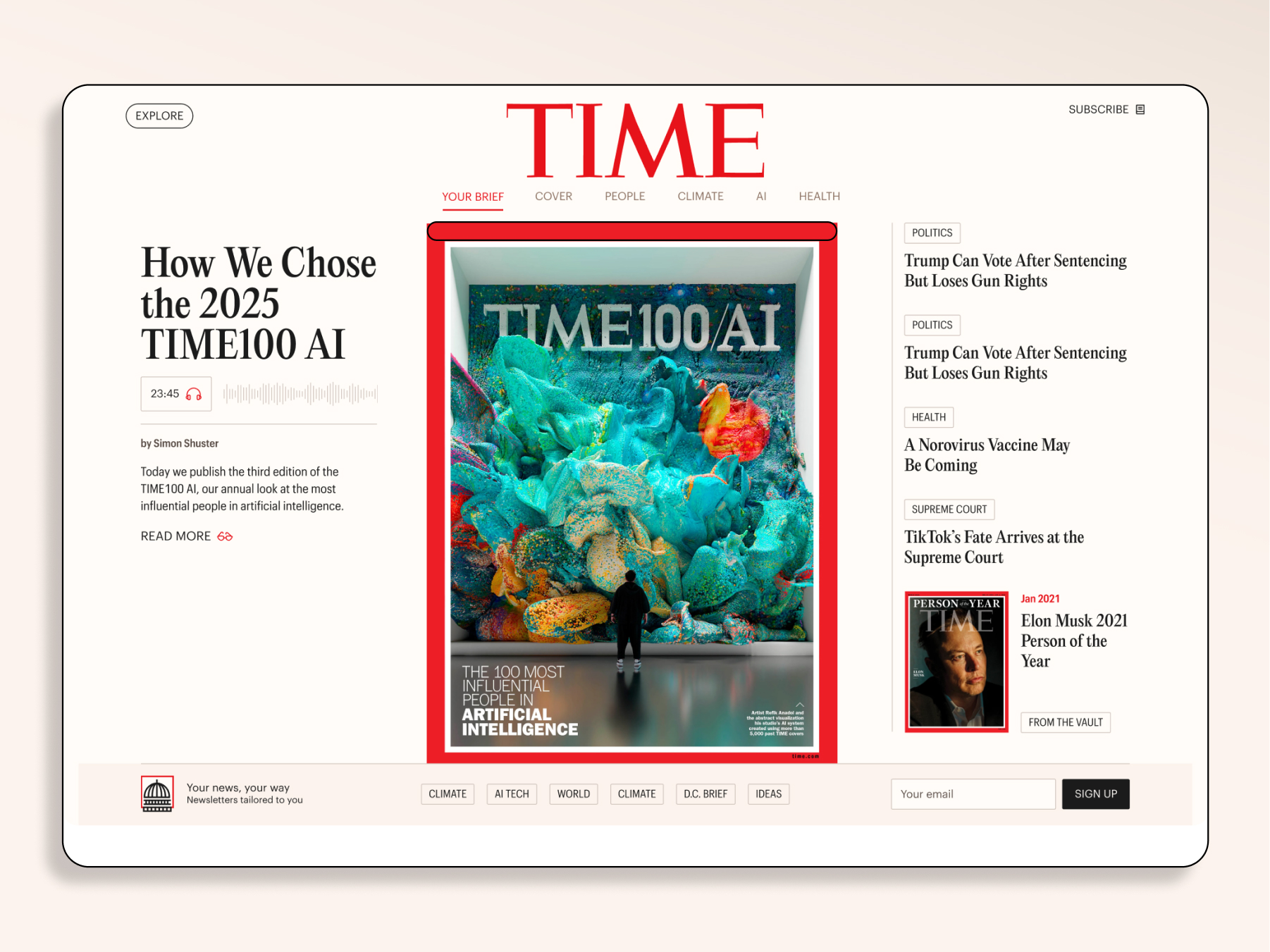 We redesigned the homepage as an elegant, curated environment that prioritizes editorial judgment over algorithmic chaos. Dedicated modules surfaced TIME’s core coverage pillars (AI, Health, Climate, Culture), reinforcing authority through an intentional hierarchy.