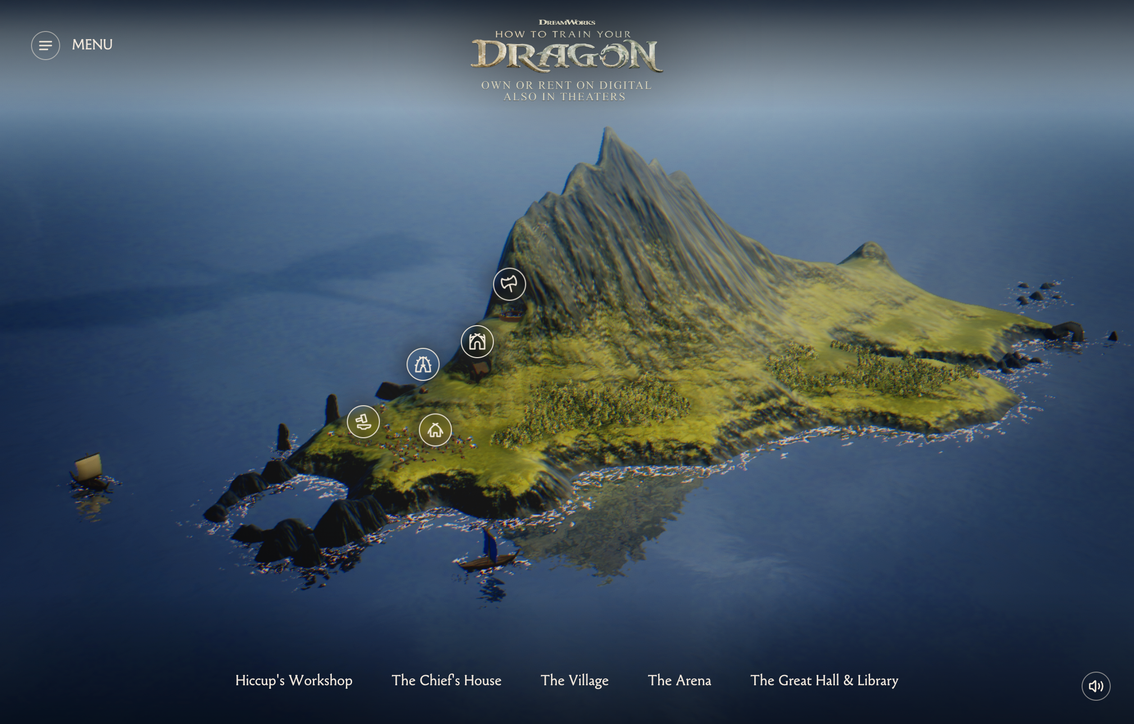 1. A Living, Breathing World: To make the experience feel truly visceral, we created a fully explorable geographically accurate WebGL 3D island from scratch based on reference imagery complete with handcrafted Viking ships and wooden village huts to capture the life and comings-and-goings of the inhabitants living on the island. We also integrated real-time night and day location data and sensory weather patterns giving each fan a unique, personalised experience each time they visited Berk.
